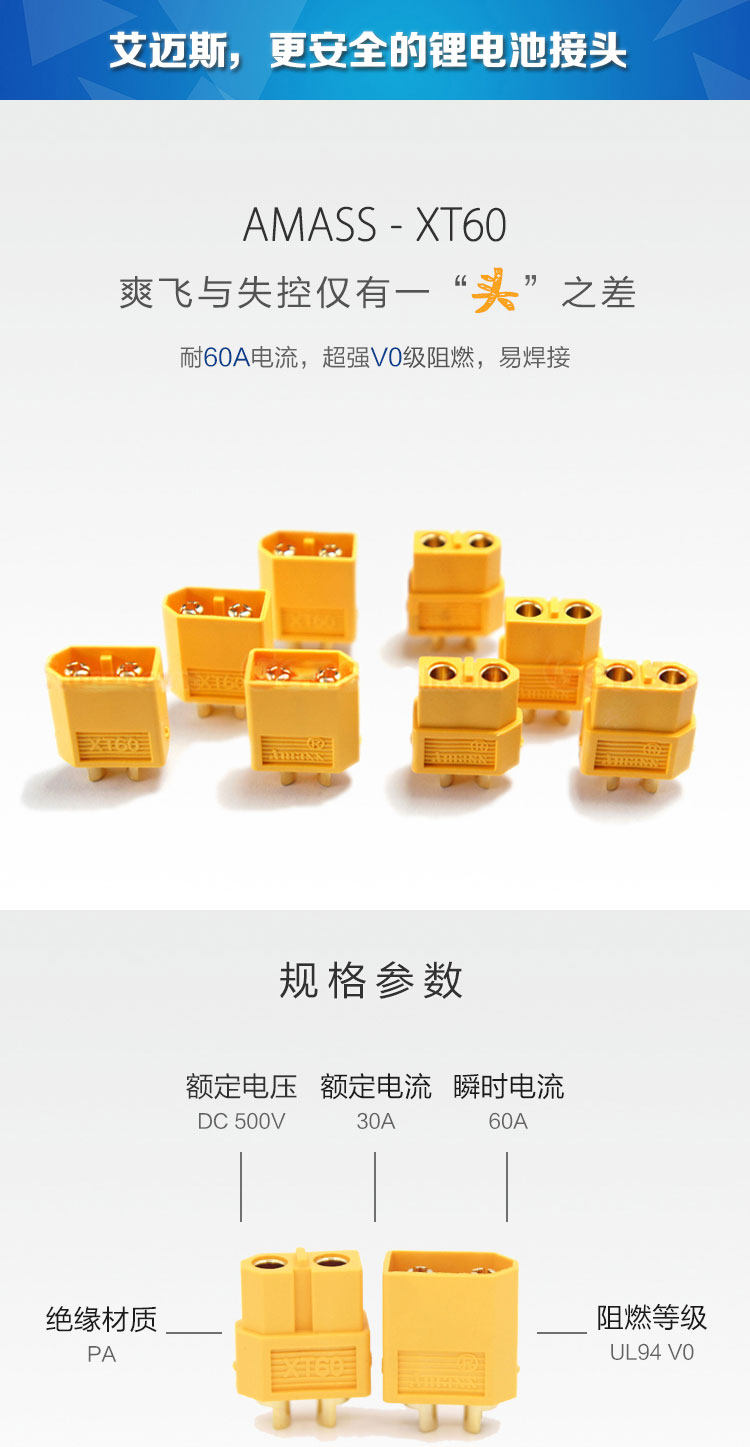 XT60 Синий 3,5 мм Позолоченный Банан Штепсельная Вилка TСоединительНазвание продукта штепсельная вилка AMASS XT60Модель продукта: XT60Применимые продукты: для батарей, электрической регулировки, зарядного устройства и т. Д.Преимущества продукта:1. Запатентованные продукты нового поколения, материнский конец для аккумулятора, Мужской конец для электрического регулируемого зарядного устройства.2. Оболочка хвостовой вогнутой конструкции, легко сварить, защищает Паяные соединения от водяного пара.3. Точная обработка пресс-форм, близкая к зазору, хорошая производительность уплотнения.4. Четкий символ положительной и отрицательной полярности.5. Толщиной с позолотой, с большой ток вилка типа банан дизайн, большего размера, свяжитесь с нами, несмотря на то, что это 3,5 мм Сделано в Китае, но может выдержать постоянную 80A амплитудных значений, 120A большого тока.6. Специальная конструкция оболочки + дизайн паза карты, чтобы решить проблему затычка головной боли, но также более тесно подключить вилку, более красивый внешний вид.7. Противоскользящая конструкция штепсельной вилки, легко подключается и тянет.8. Гуманная Хвостовая сварочная линия рот 180 градусов наружу аранжирует, позволяет сварочные работы быть проще.6,7 г/компл.Этот продукт XT60-компания amass, проводящая более года, для изучения преимуществ и недостатков традиционных вилок, были разработаны многократные тесты, были улучшены почти недостатки существующих штепсельных вилок модели, когда-то введен в США, вызывая популярность.