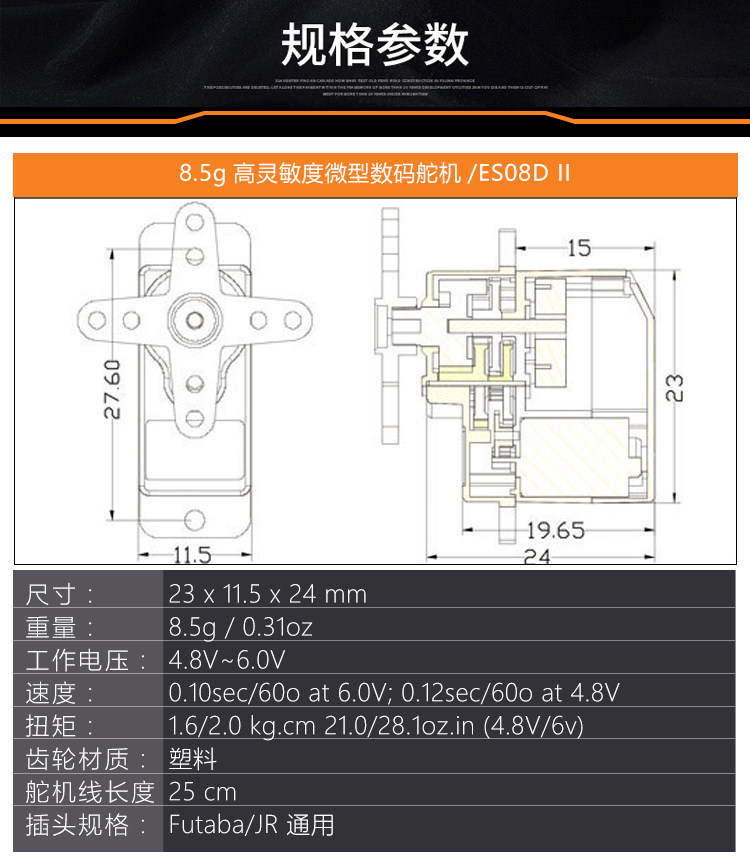Скорость работы: 0.12sec/60 ° 4,8 V; 0.10 сек/60 ° 6V