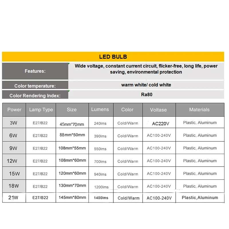 Наименование товара:Светодиодный светильник, светодиодная лампа, светодиодная лампа Тип основания:E27 ,E14Мощность: 3 Вт/5 Вт/7 Вт/9 Вт/12 Вт/15 Вт/18 Вт/21 ВтНапряжение:100-240 В переменного тока, подходит для разных стран напряжения (100 В переменного тока, 110 В, 220 В 230 В или 240 В) Светодиодный Тип:SMD 2835 Гарантия:1 годИндекс цветопередачи:Ra80