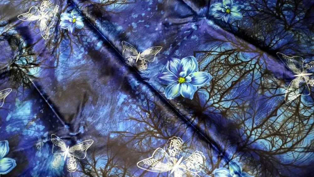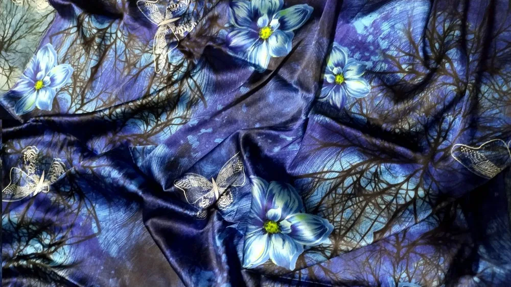 ![]() Бесплатная доставка эластичный атлас 100% шелк тутового шелкопряда цифровая печать одежда Cheongsam ткань Fleur-de-lis синийUS $58,30/Метр