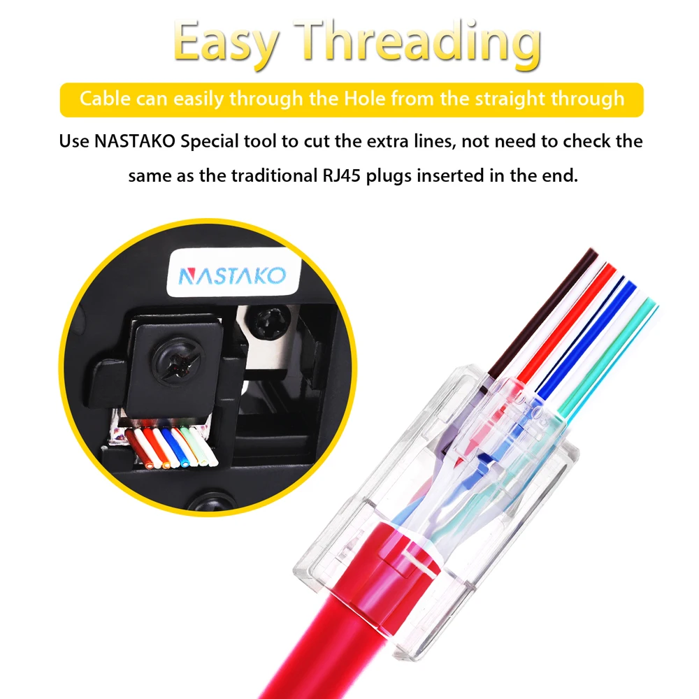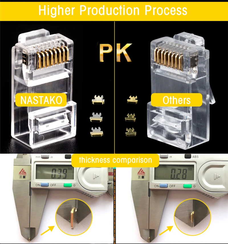 Бренд: NASTAKO Cat.6/Cat.5e RJ45 неэкранированный Модульный штекер. 8P8C сетевой кабель RJ45 разъем. Диаметр отверстий: Φ1.05 мм. Cat.6 разъемы подходят для Cat.6 / Cat.5e круглых кабелей UTP (AWG 24 ~ AWG 26). Диаметр отверстий: Φ0.95 мм. Разъемы Cat.5e подходят для Cat.5e / Cat.5 круглых кабелей UTP (AWG 24 ~ AWG 26). Позолоченные провода для лучшей передачи данных и более высокой мощности сигнала.