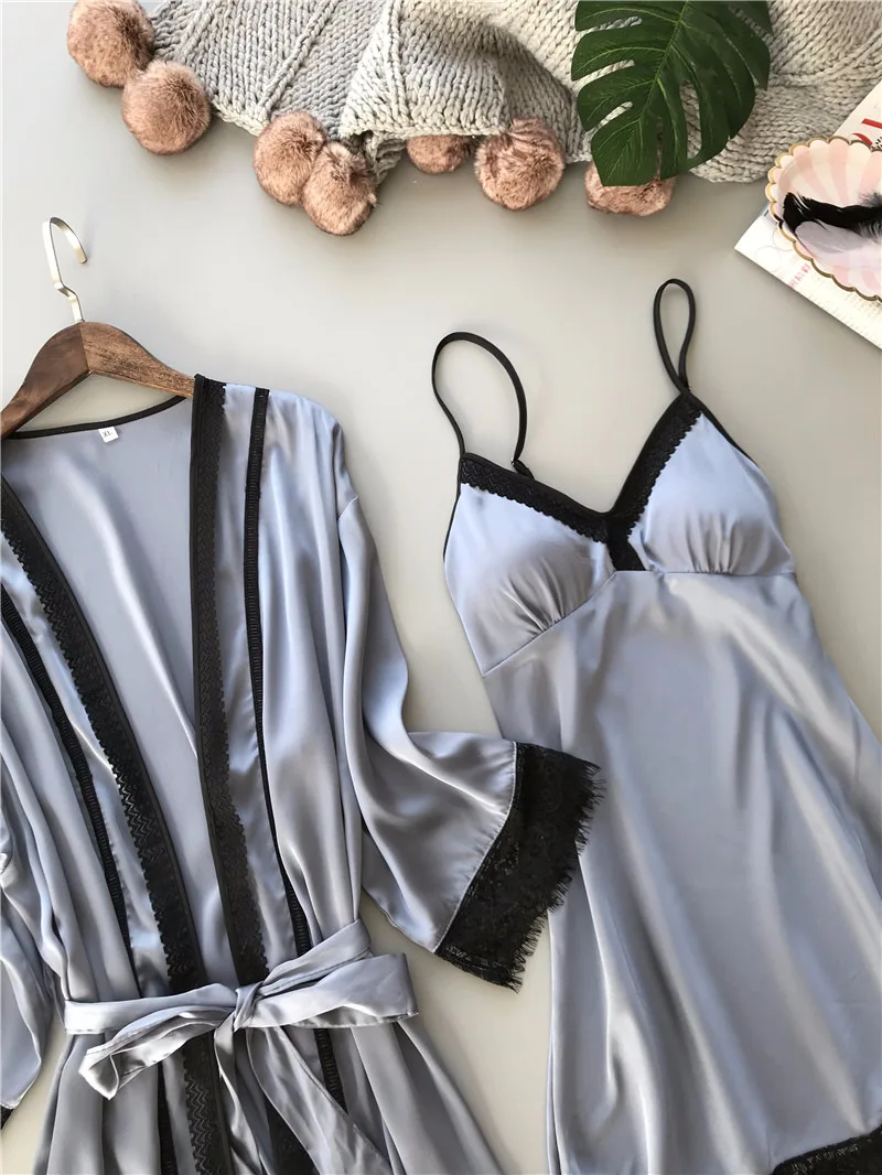 Сексуальная ночная рубашка женская летняя ледяная шелковая бретель Ночная рубашка костюм из двух предметов с бюстгальтером халатик кружевной Шелковый домашний костюм