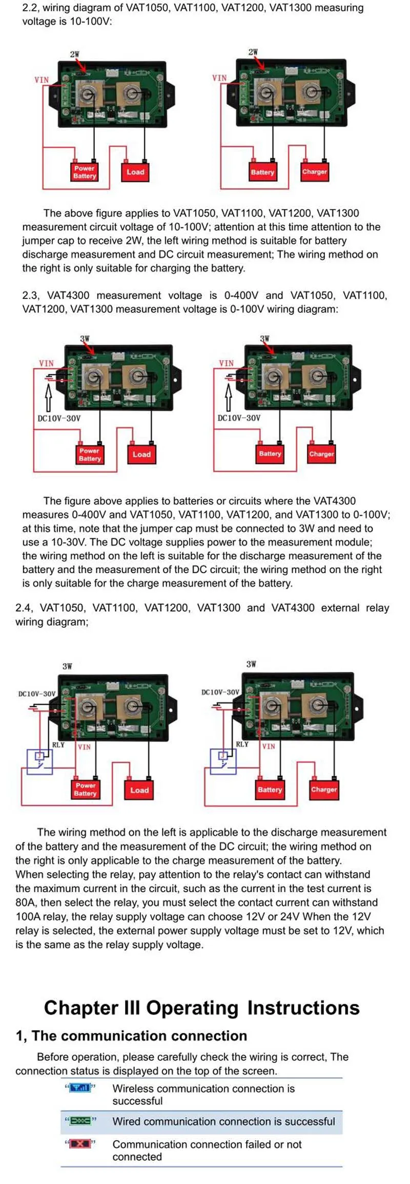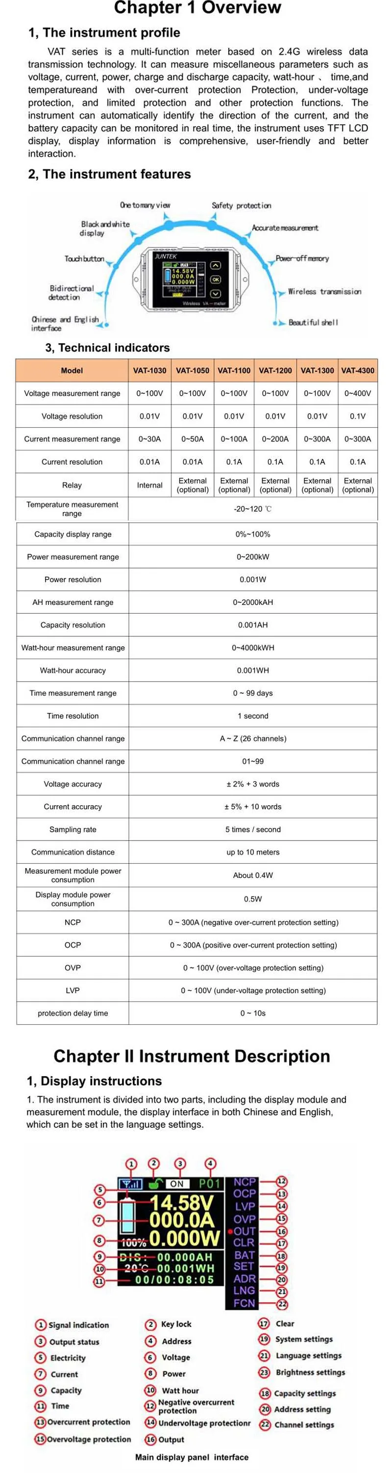 VAT Series A может измерять напряжение постоянного тока, ток, мощность, заряд и разрядную мощность, ватт-час, время, температурный цветной кулонный метр; Счетчик делится на измерительный модуль и модуль дисплея, два модуля могут использовать usb-кабель для подключения передачи сигнала, Но также через встроенную беспроводную радиочастотную цепь для передачи сигналов; Аксессуары включают usb-кабель для передачи данных и датчик температуры; Модуль измерения может идентифицировать передний и обратный ток в обоих направлениях, без изменения проводки можно достичь заряда аккумулятора и контроля емкости разряда; Очень подходит для использования солнечной энергии, энергии ветра, аккумулятора электромобиля.