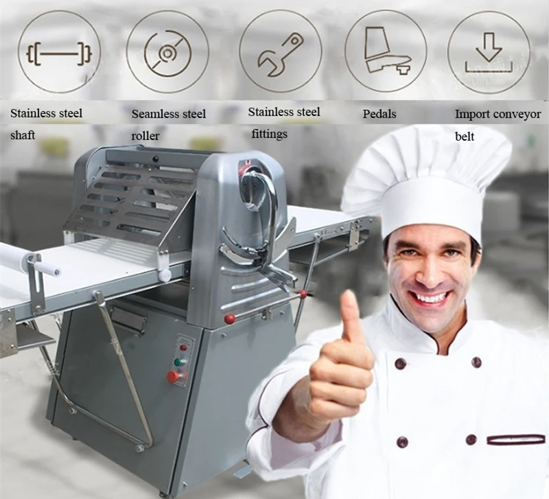 Машина имеет специальный moter и выполняет двухстороннее нажатие. Машина оснащена защитным щитом, работает безопасно и надежно. Они специально подходят для работы прессования теста на тонкие кусочки в магазинах тортов в западном стиле, гостиницах, ресторанах, офисных обеденных залах и т. д. Машина со специально обработанными поверхностями, которые долговечны в использовании |