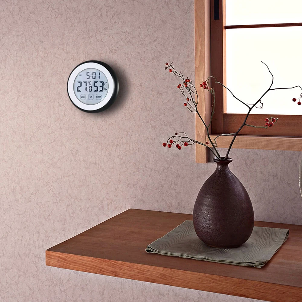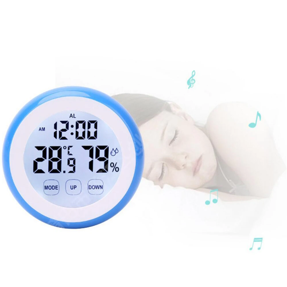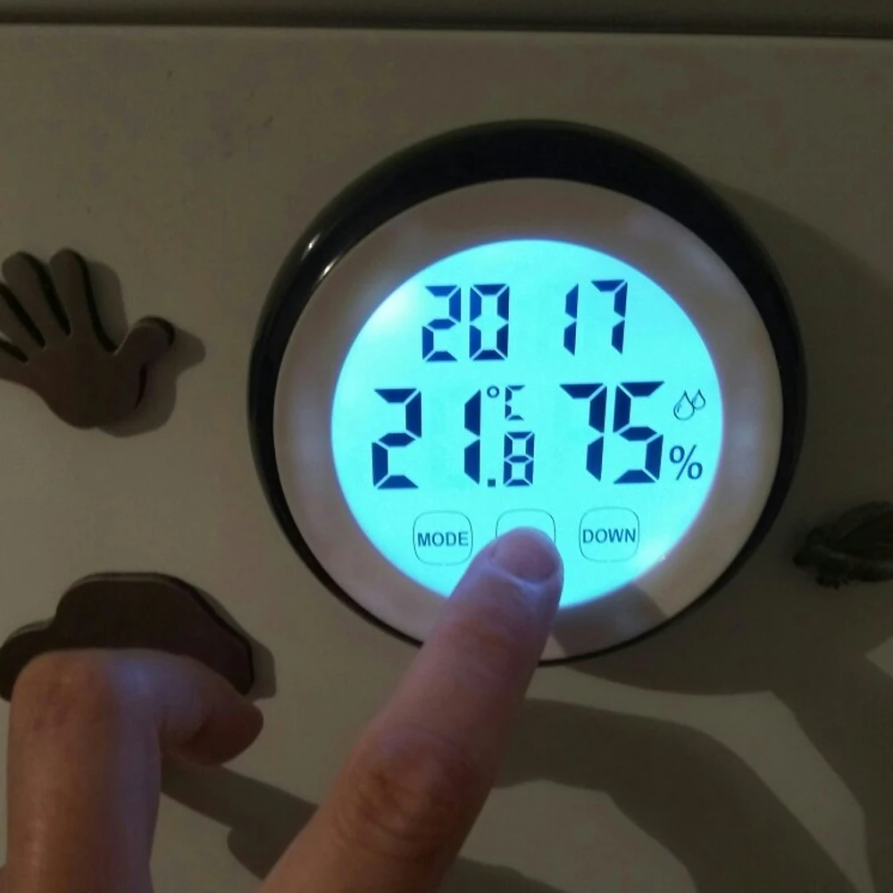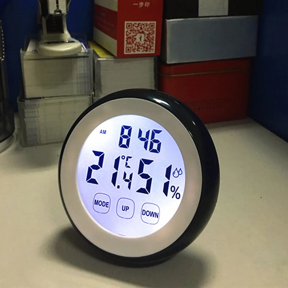 Особенности:1, будильник2. Время отображения: 12 часов/24 часа3, сенсорный ЖК-экран4. Светодиодный фонарь5. Отображение влажности и температуры (℃ / ℉)6, с кронштейном, подвесным отверстием и магнитами на спинеПараметры:* Диапазон измерения температуры: от 0 °C до + 50 °C* Диапазон измерения влажности: от 20% до 99%* Допуск/Точность измерения температуры: +/- 2 °C / °F* Допуск/точность измерения влажности: +/- 5%* Вес нетто: 0,11 кг* Размер часов Д * Ш * В (см): 9*9*2,6 (см)* Мощность: 2 размера AAA 1,5 v батареи (не включены)Смотрите так же другие товары: