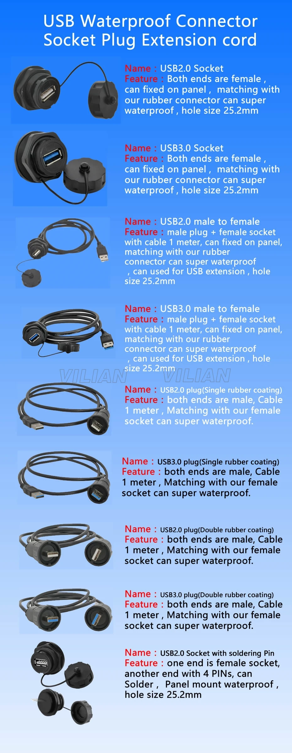USB водонепроницаемый разъем IP67 кабель 1 м шнур питания разъем USB2.0 USB3.0 кабель-удлинитель для мужчин двойной резиновый 10 шт.