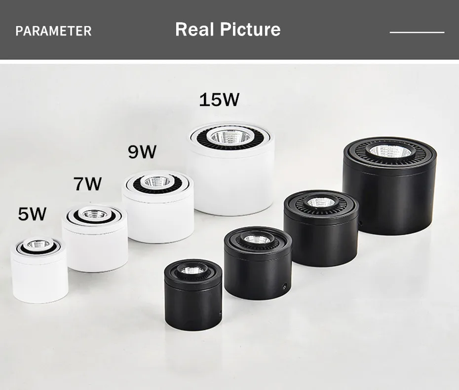 100% Новый бренд Вход: AC85-265V Материал корпуса: высококачественный алюминий, устойчивый и прочный. Быстрое рассеивание тепла. Продолжительная работа. Потребляемая мощность: 5 Вт 7 Вт 9 Вт 15 Вт (белый корпус и черный корпус на выбор) Светодиодный светильник источник/количество (шт): Высокий люмен COB, светодиодный чип epistar Люмены (лм): 100-110 лм/Вт Рабочая температура. : -25 градусов Цельсия-+ 50 градусов Цельсия Индекс цветопередачи: Ra >80 Светильник Цвет: холодный белый (6000-6500K) Теплый белый (3000-3500K) Натуральный белый (4000-4500K)
