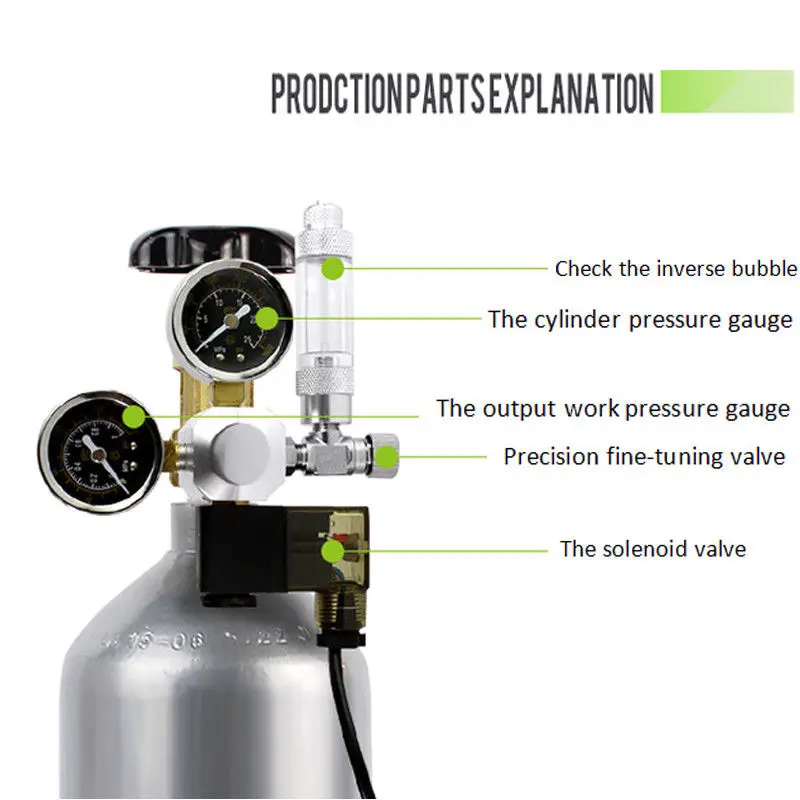Материал: 3,4 нержавеющая сталь + алюминиевый сплав Размеры: 12,5*16*7,5 Вес упаковки: 620 г Обратный пузырь: просто нужно добавить 4/5 воды перед использованием. Рабочее давление на выходе: Выходное давление нормальное на 40 ~ 80PSI. Манометр цилиндра: давление в бутылке изменится при комнатной температуре. Это нормально, если он показывает между 500 и 1000. Если он быстро снижается, это означает, что ваша кислородная бутылка должна быть надута.