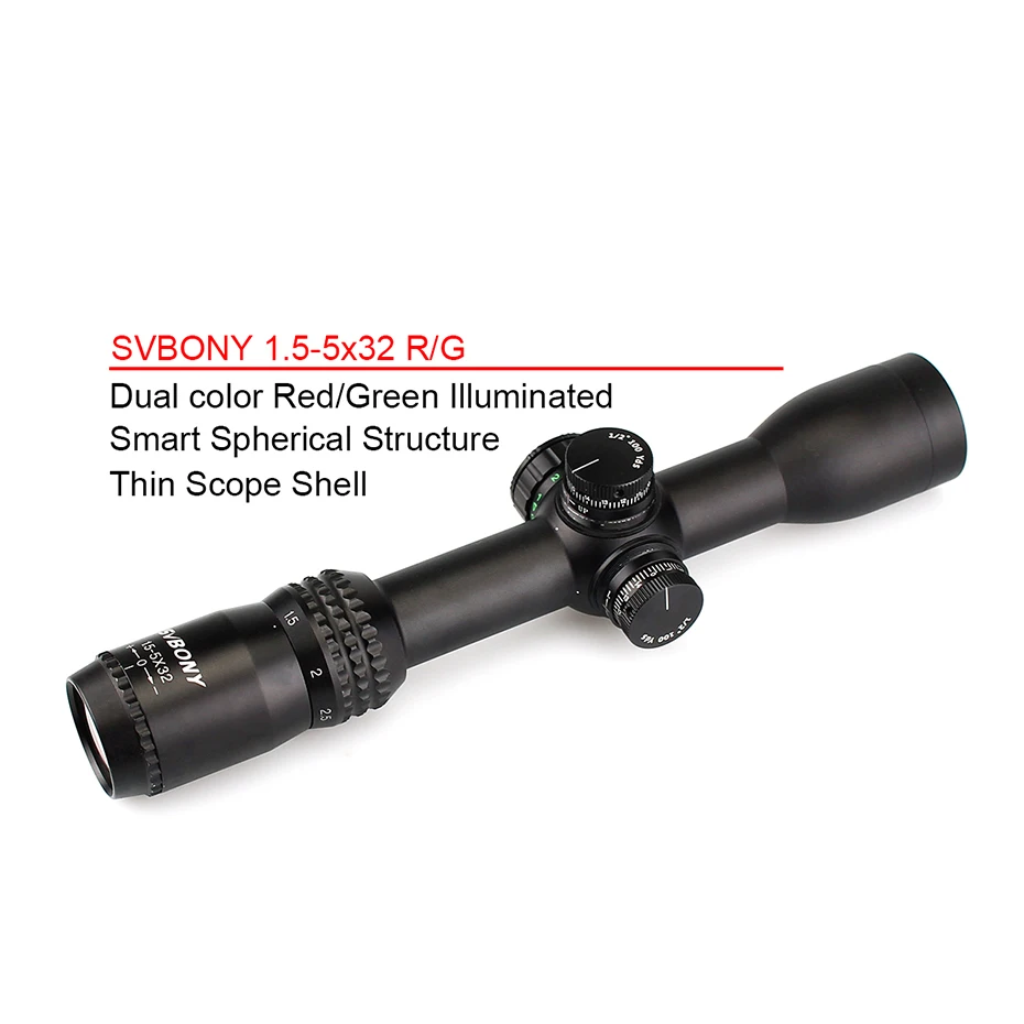 Бренд: SVBONY Мощность: 1.5X-5X Объектив: 32 мм/1,26 дюйма Диаметр трубки: 25,4 мм/1 дюйм Длина: 259 мм/10,2 дюйма Рельеф глаз: 103-80 мм/4-3,1 дюйма Поле зрения при 100 м: 22-7,5 м/100 м Поле зрения при 100 ярдов: 66-22.6ft/100yds Нажмите значение: 1/4 Красная и зеленая подсветка: Да Вес: 435 г/15,3 унций