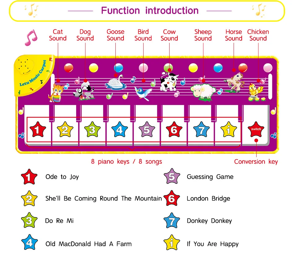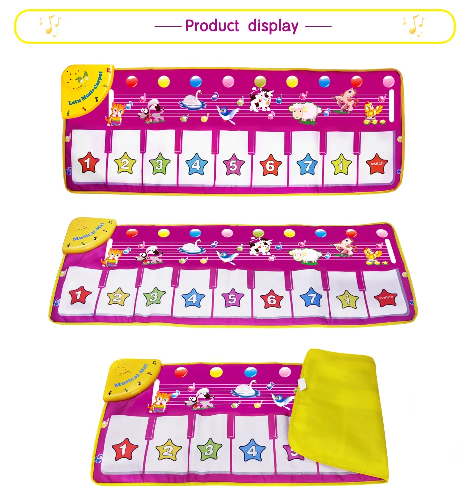 Совершенно новый, высококачественный и экологически чистый материал для детей. Размер: 100x36 см, достаточно большой для 2-3 детей, играющих вместе. Нужен аккумулятор 3 x "AA". (Не входит в комплект) Тема милых животных, которая легко полюбит вашего ребенка. Мульти-функция поддержки виды игры. Дети не только развивают свой музыкальный интеллект, но и веселятся через этот коврик.