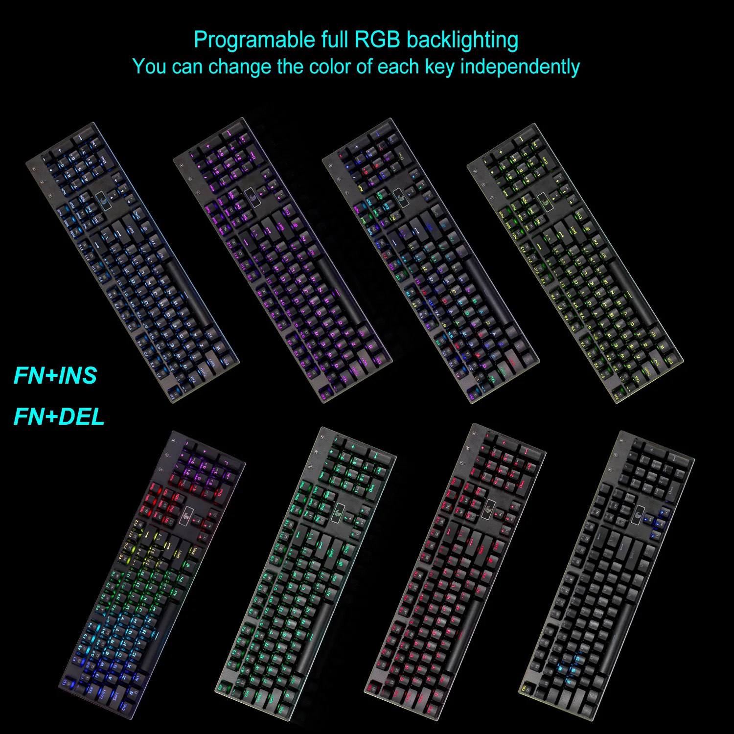 FN + INS: 10 режимов blacklight, сделать красивый вид на вашем столе, в выбранных режимах, нажмите FN + Del может быть установлен в сплошной цвет (7 основных цветов в наличии) нажмите FN + 1-5 в режим фиксированной игры, в режиме игры нажмите FN + HOME, чтобы установить цвет каждой кнопки без драйвера