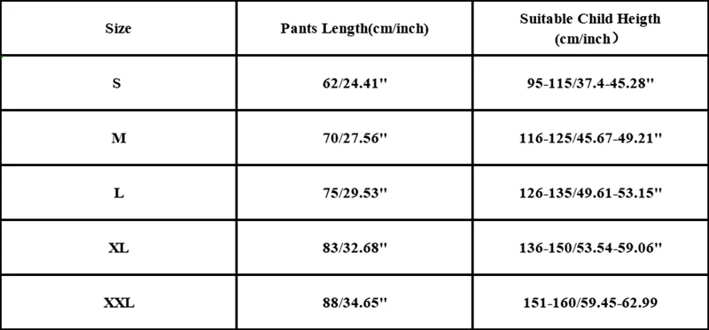 Размер S: Длина брюк: 62 см/24,41 дюйма, для детей ростом 95-115 см/37,4-45,28 дюйма.