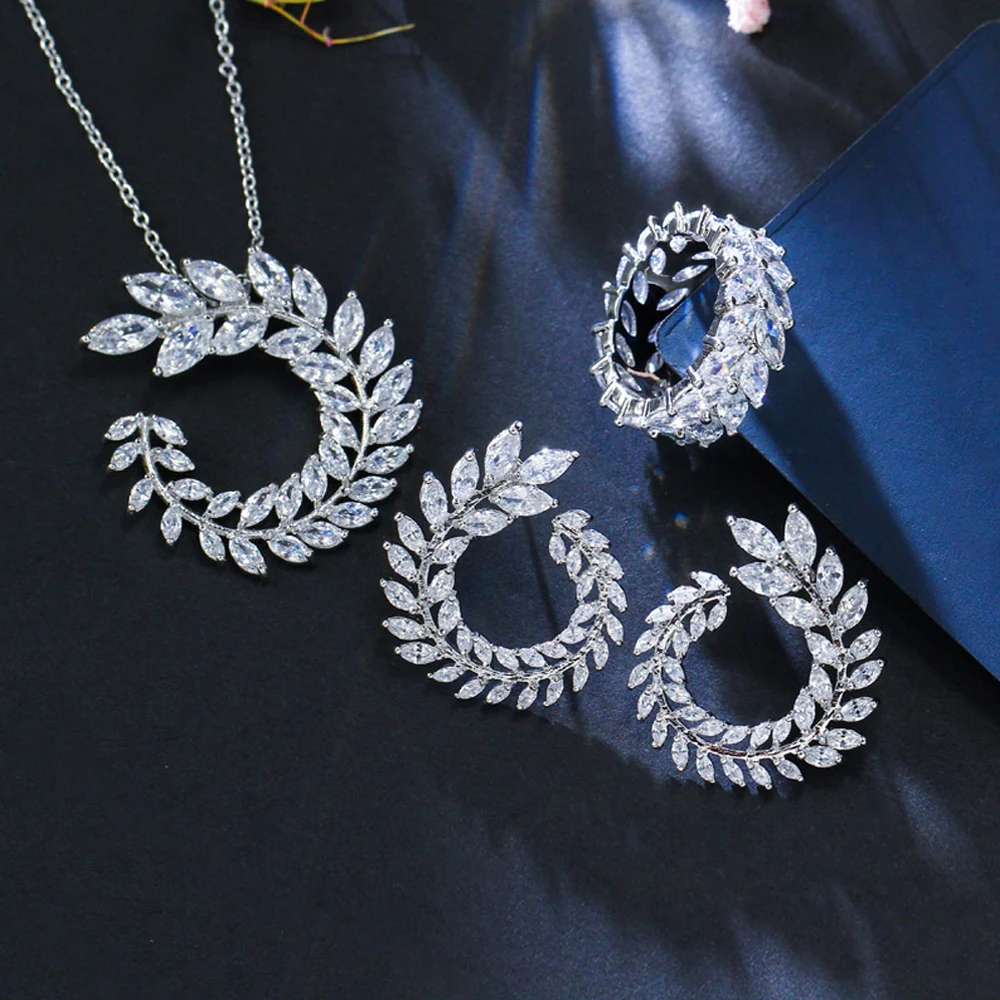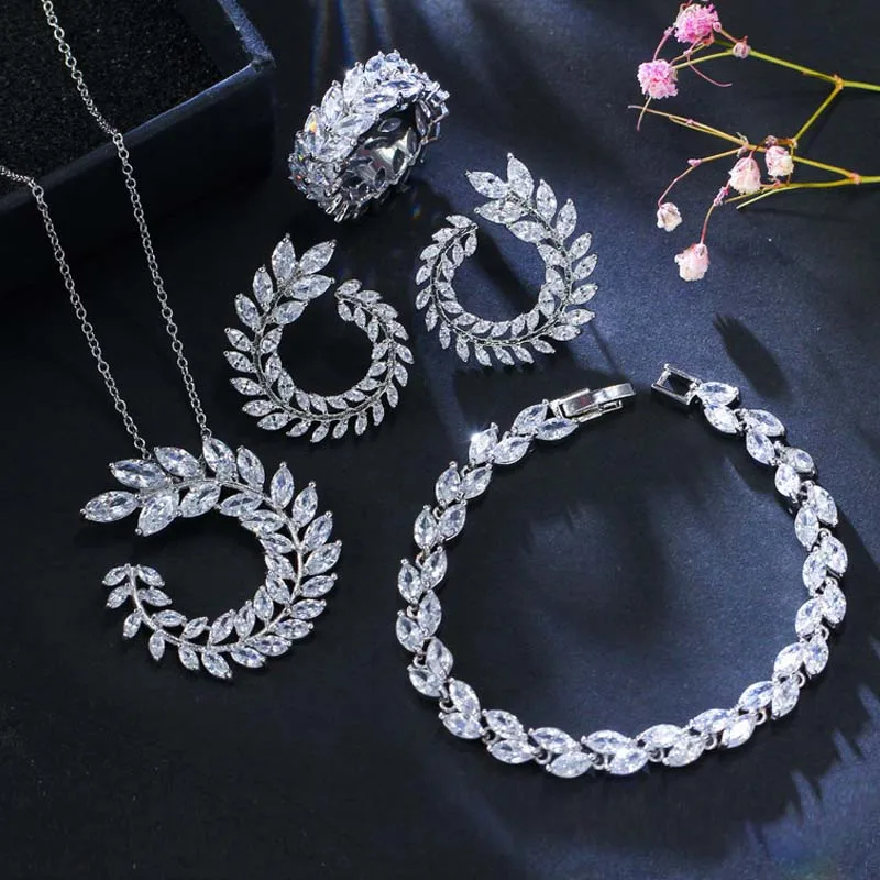 ThreeGraces уникальный дизайн CZ камень Сверкающий Лист оливковой ветви форма кольца Браслеты Серьги Ожерелье 4 шт Ювелирные наборы JS253