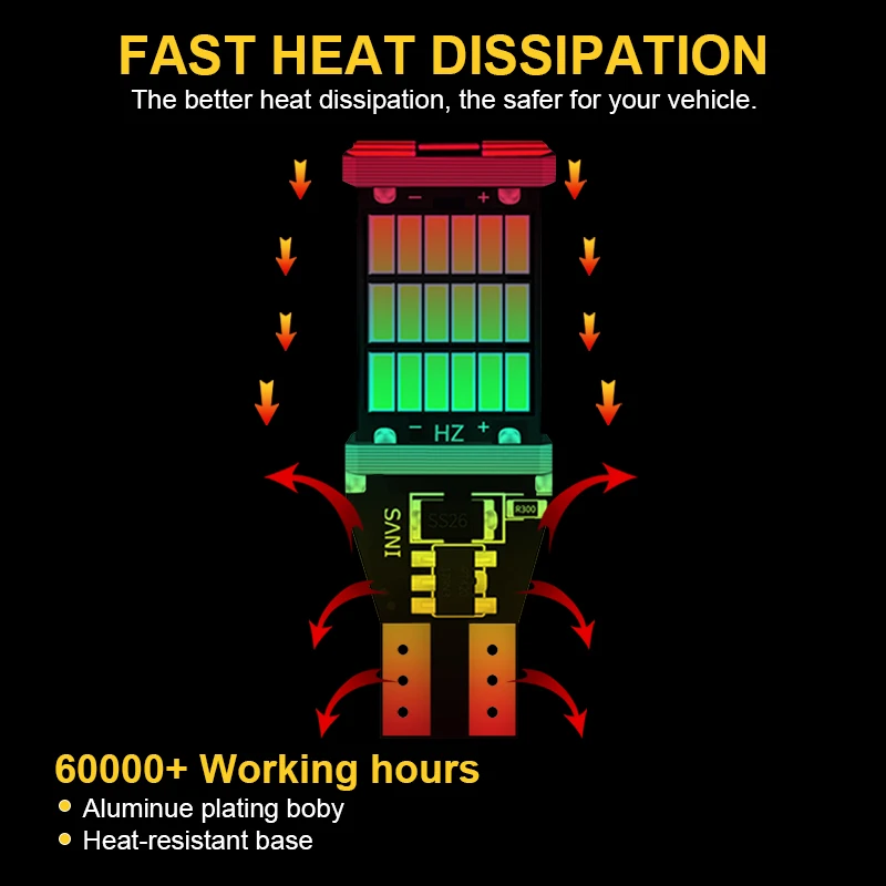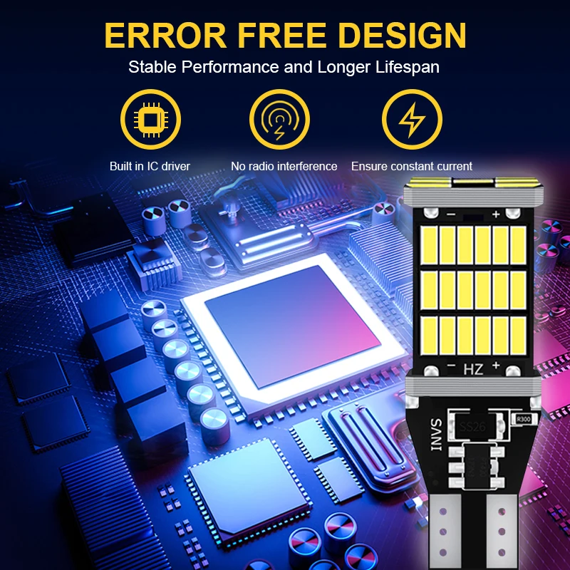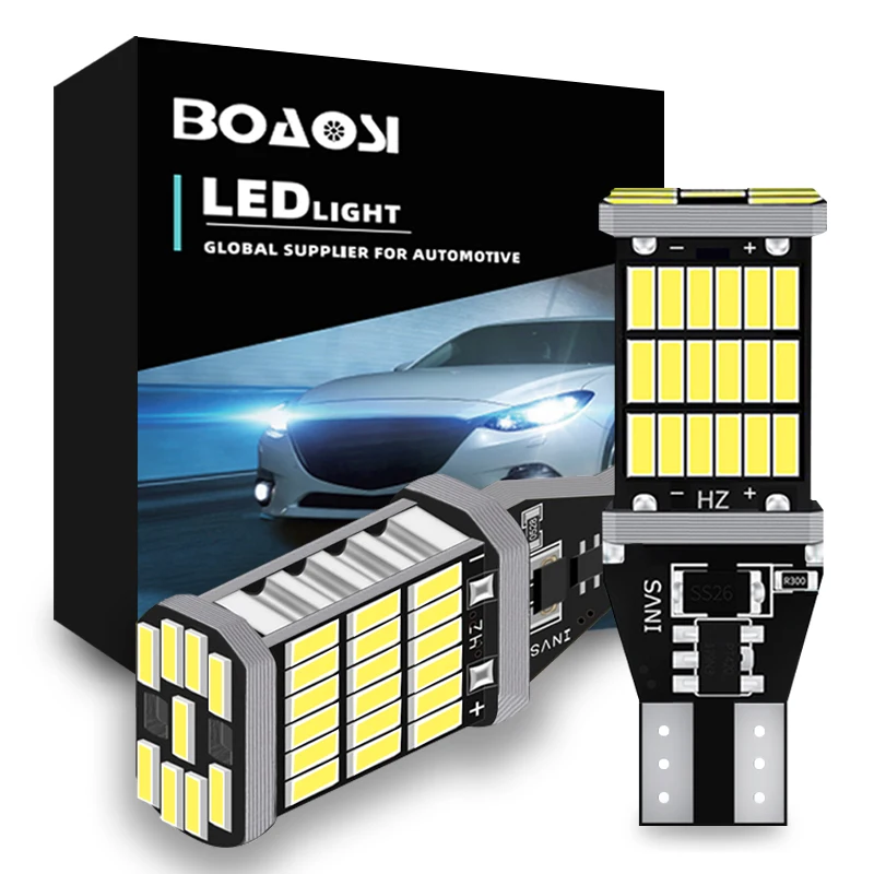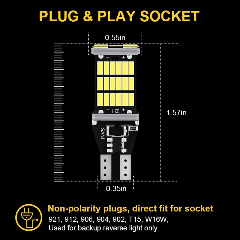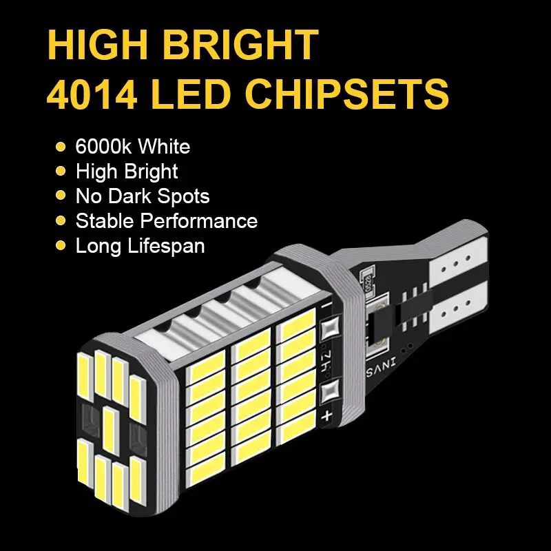 СпецификацияТип разъема: 921 912 W16W T15Светодиодный чип: 45 * 4014smdСрок службы: 65000 часовРабочее напряжение: 12 ВВысокое качество и супер яркий светодиодный светильникПростая установка, просто plug & play, прямая замена старых ламп накаливанияНет задержки в освещении, гораздо безопаснее, предотвращает опасность столкновения сзадиПосылка включает в себя2 шт. T15 W16W лампыПримечаниеПеред покупкой проверьте розетку вашей старой лампыМы рекомендуем профессиональную установку