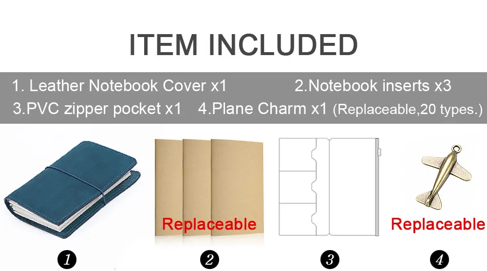 1. Кожаный чехол для ноутбука x1 2. Записная книжка вставляет x3 (пустой, правили, сетка, но вы можете оставить нам сообщение, чтобы изменить его, у нас есть 8 типов) 3. ПВХ карман на молнии x1 4. Шарм самолета x1 (вы можете оставить нам сообщение, чтобы изменить его, у нас есть 20 типов)