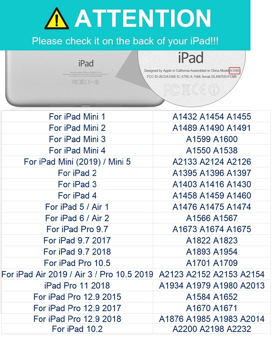 Этот чехол подходит только для 5 моделей: 1. Для iPad Air ( A1476,A1475,A1474) 2. Для iPad Air2 ( A1566,A1567) 3. Для iPad Pro 9,7 (A1673,A1674,A1675) 4. Для iPad 9,7 2017 ( A1822,A1823) 5. Для iPad 9,7 2018 ( A1893,A1954) Нельзя использовать для других моделей планшетов. Перед размещением заказа, пожалуйста, внимательно проверьте модели вашего планшета. Когда вы размещаете заказ, убедитесь, что ваш адрес на 100% правильный, особенно русские друзья, пожалуйста, оставьте свое полное имя, в противном случае мы не несем ответственности за сбой доставки!