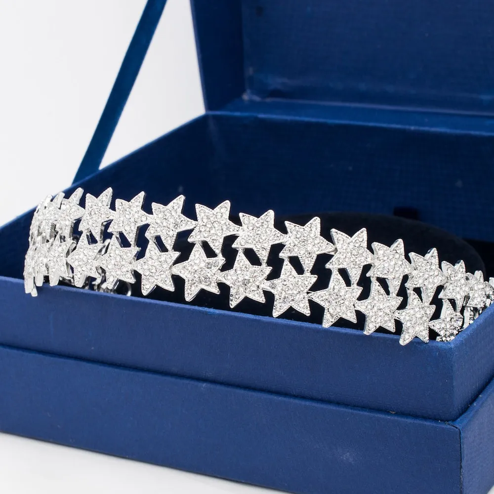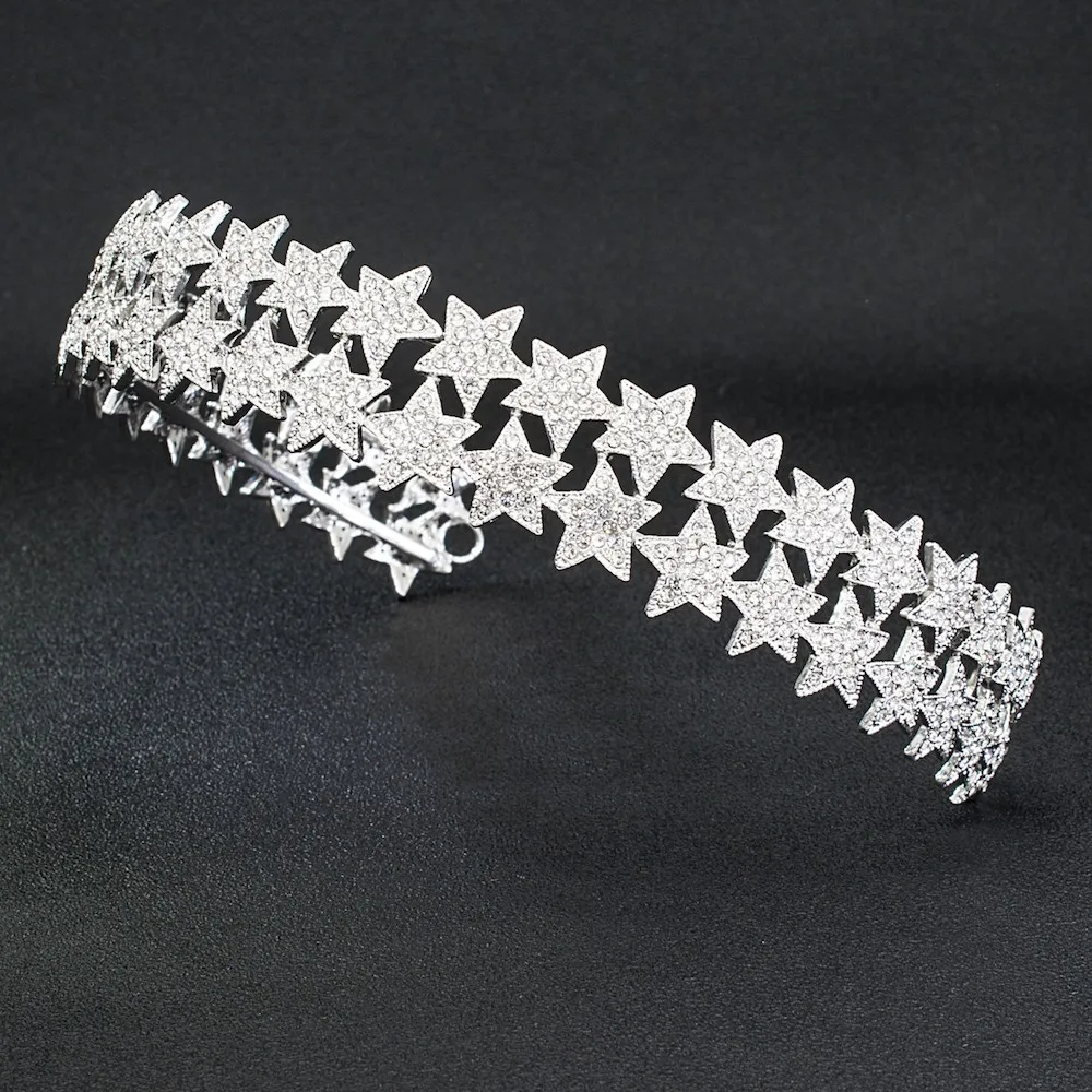 Это совершенно новый дизайн, два ряда звезд, гибкий ободок для волос, вы можете носить его такой же обычный головной убор, вы также можете носить его как минимум на картинке. Он изготовлен из многих высококачественных страз в металлическом основании,Он может быть гибким, Диаметр регулируется. Длина составляет 20 см со стразами, прибл. Около 2/3, очень подходит для женщин, которые могут принимать участие в свадебных торгах или на каждый день.