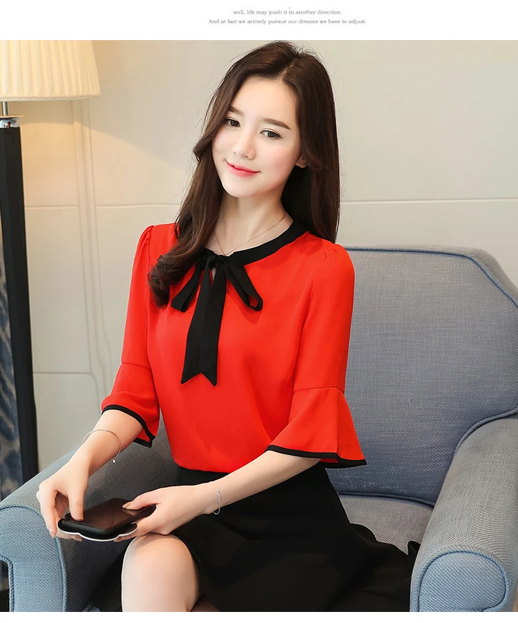 Женский топ с галстуком-бабочкой, модная летняя блузка в Корейском стиле, рубашка, Милый офисный женский красный желтый шифоновый топ с расклешенными рукавами