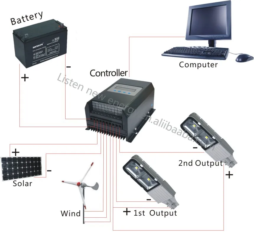 | Дисплей содержание | Батарея: напряжение; Ток зарядки; процент заряда батареи. Ветер: напряжение; Ток зарядки; скорость вращения; выходной ток; Выходная мощность Солнечная: напряжение; Ток зарядки. Нагрузки: ток; мощность; Рабочий режим. Система: состояние; Генерируемая энергия; код ошибки |