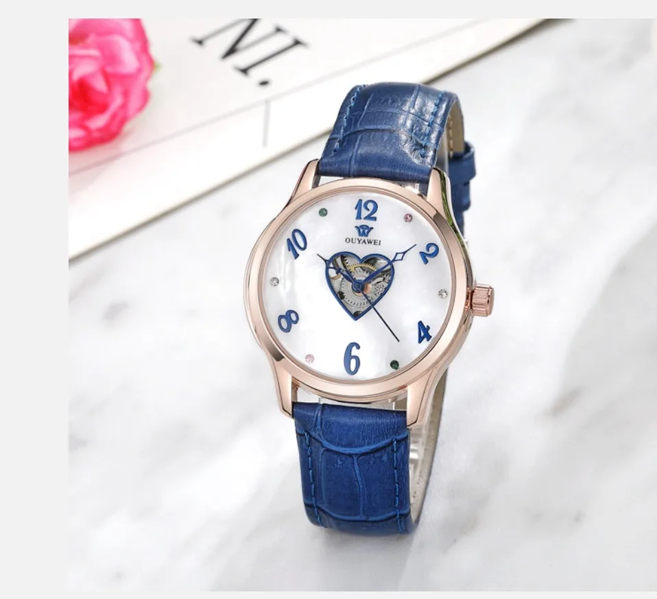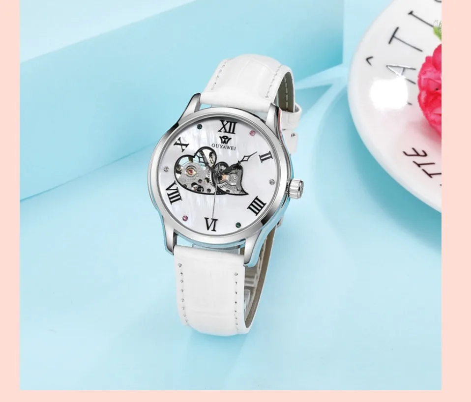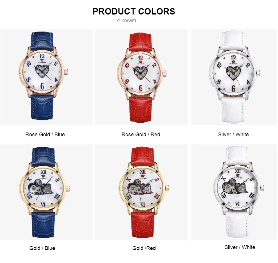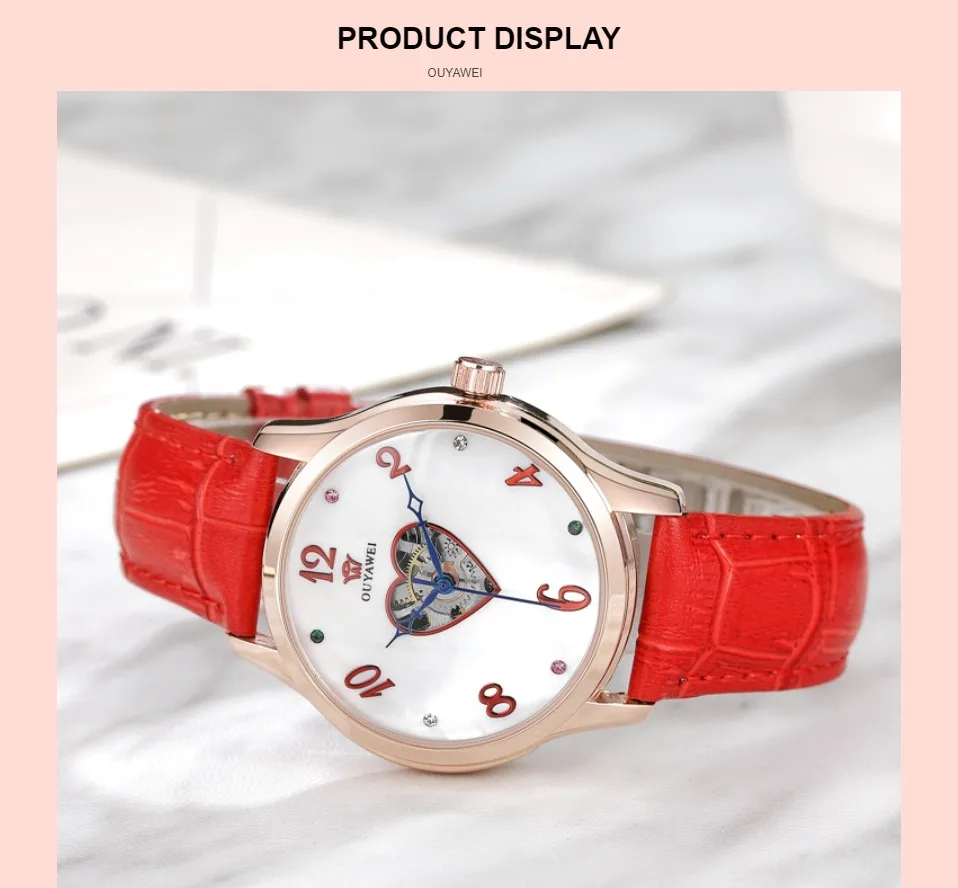 1. 100% абсолютно новый высококачественный 2. Механическое автоматическое движение, питание от тряски, батарея не требуется 3. Кожаный ремешок для часов и круглый чехол для часов из сплава. 4. Ежедневная Водонепроницаемость до 1 атм. 5. Модный дизайн скелета сердца циферблата часов 6. Прозрачная задняя крышка