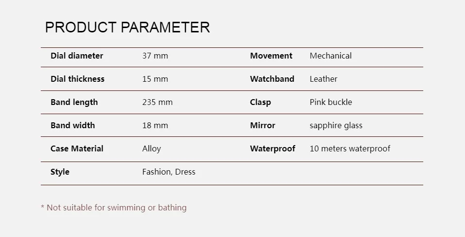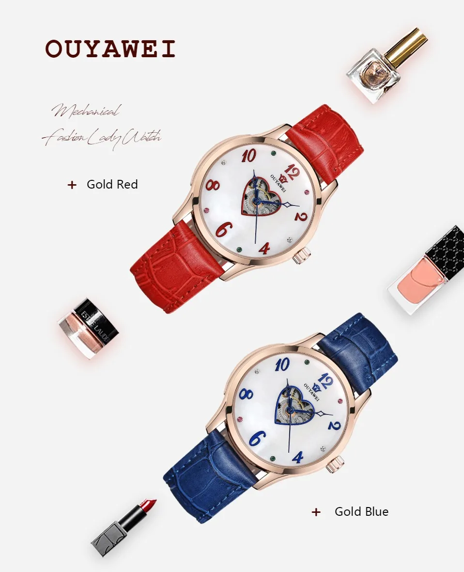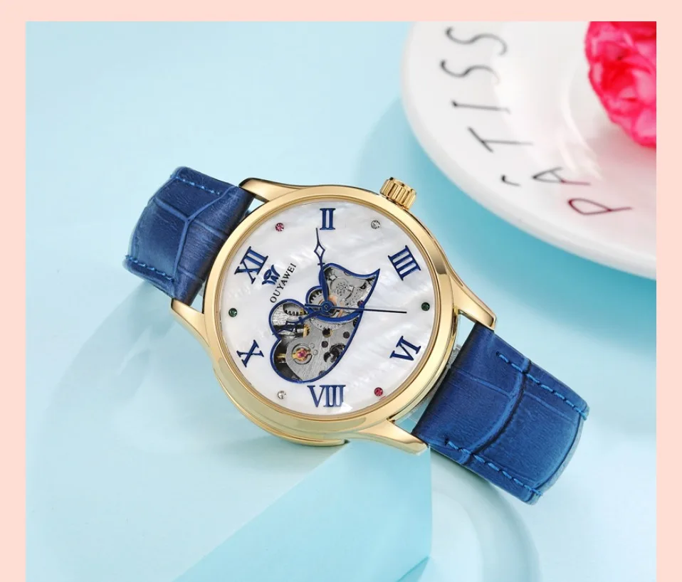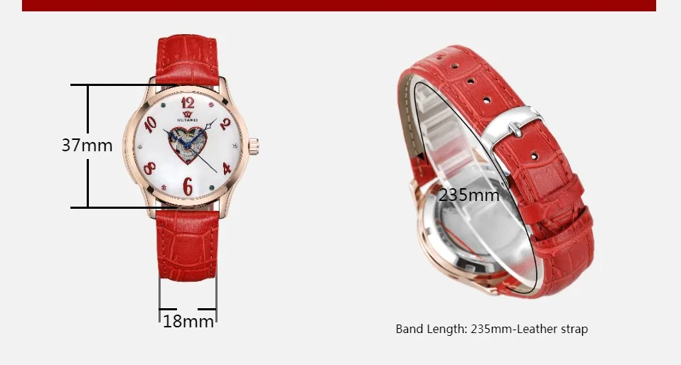 1. 100% абсолютно новый высококачественный 2. Механическое автоматическое движение, питание от тряски, батарея не требуется 3. Кожаный ремешок для часов и круглый чехол для часов из сплава. 4. Ежедневная Водонепроницаемость до 1 атм. 5. Модный дизайн скелета сердца циферблата часов 6. Прозрачная задняя крышка