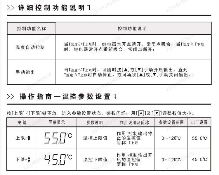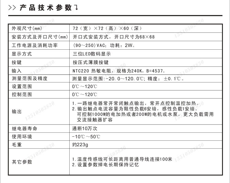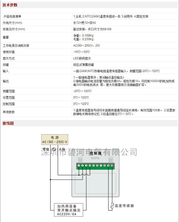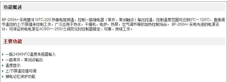 BF-210A термостат может быть комплект к нагреванию или режим охлаждения, широко используются в солнечной тепловой насос с передачей тепла в сфере отопления горячей водой и отопление, а также различные холодильных установок, морозильная камера охлаждения контроля. Один из способов температуры NTC термистор вход переменного тока, измерения точность отображения 0,1 °C, удобно для пользователей, чтобы контролировать температуру, регулируемые по высоте люстры, тренд; Контроль температуры одним выходом (реле нормально открытый, нормально закрытый контакт). Контроль температуры диапазон регулируется в диапазоне от-50 °C до 120 °C; Установка предельно прост и прямой Регулировка верхний предел установки эффективен.
