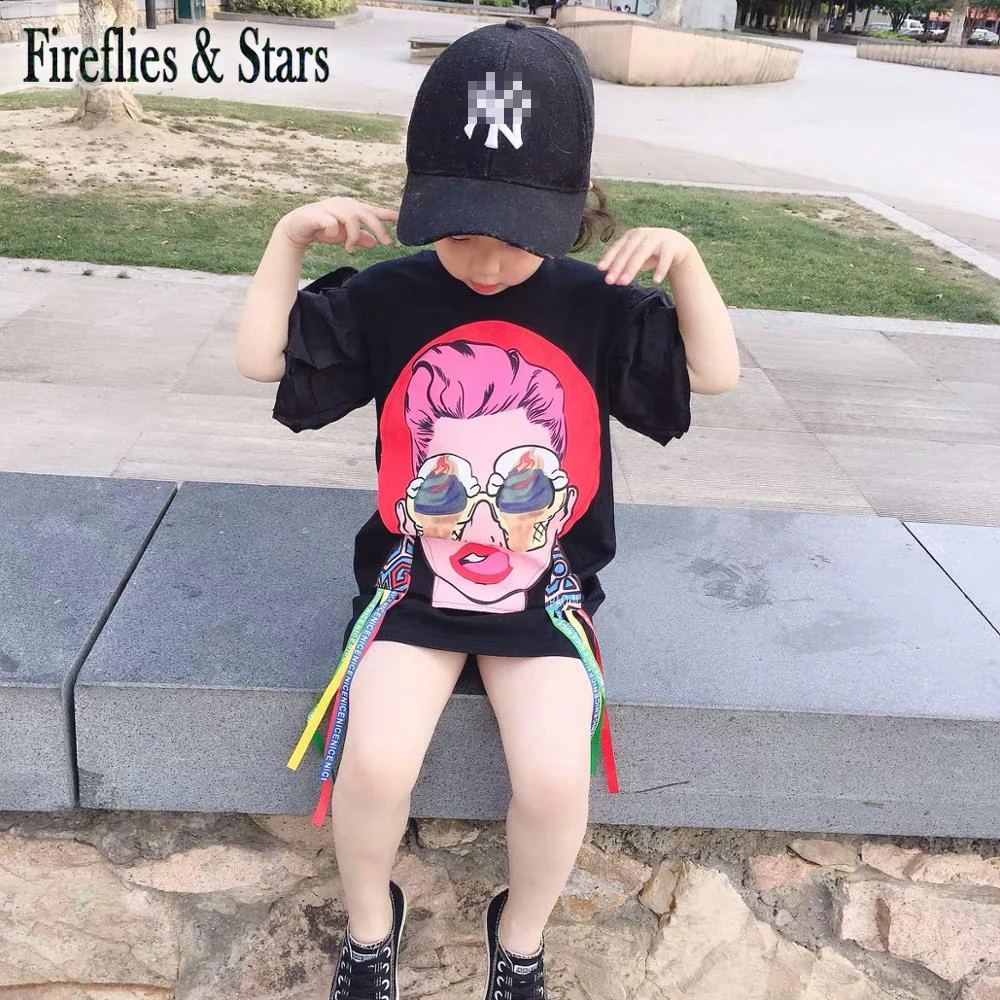 Name:Summer girls dress Kids mini dress children long tee baby streetwear fashion logo rainbow colored tape tassel 4 to 14 yrs