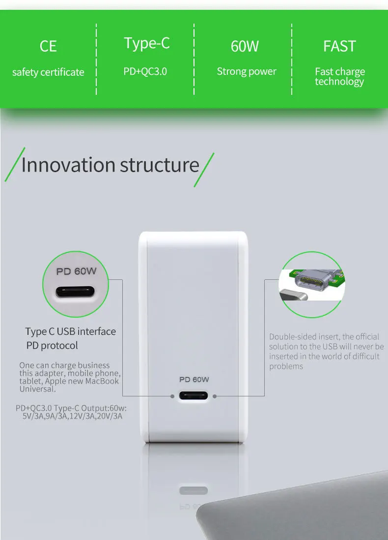 Просто подключите его к розетке и заряжайте через соответствующий кабель USB C. С быстрой зарядкой PD кабель1 *60 ВтНастенное зарядное устройство PD