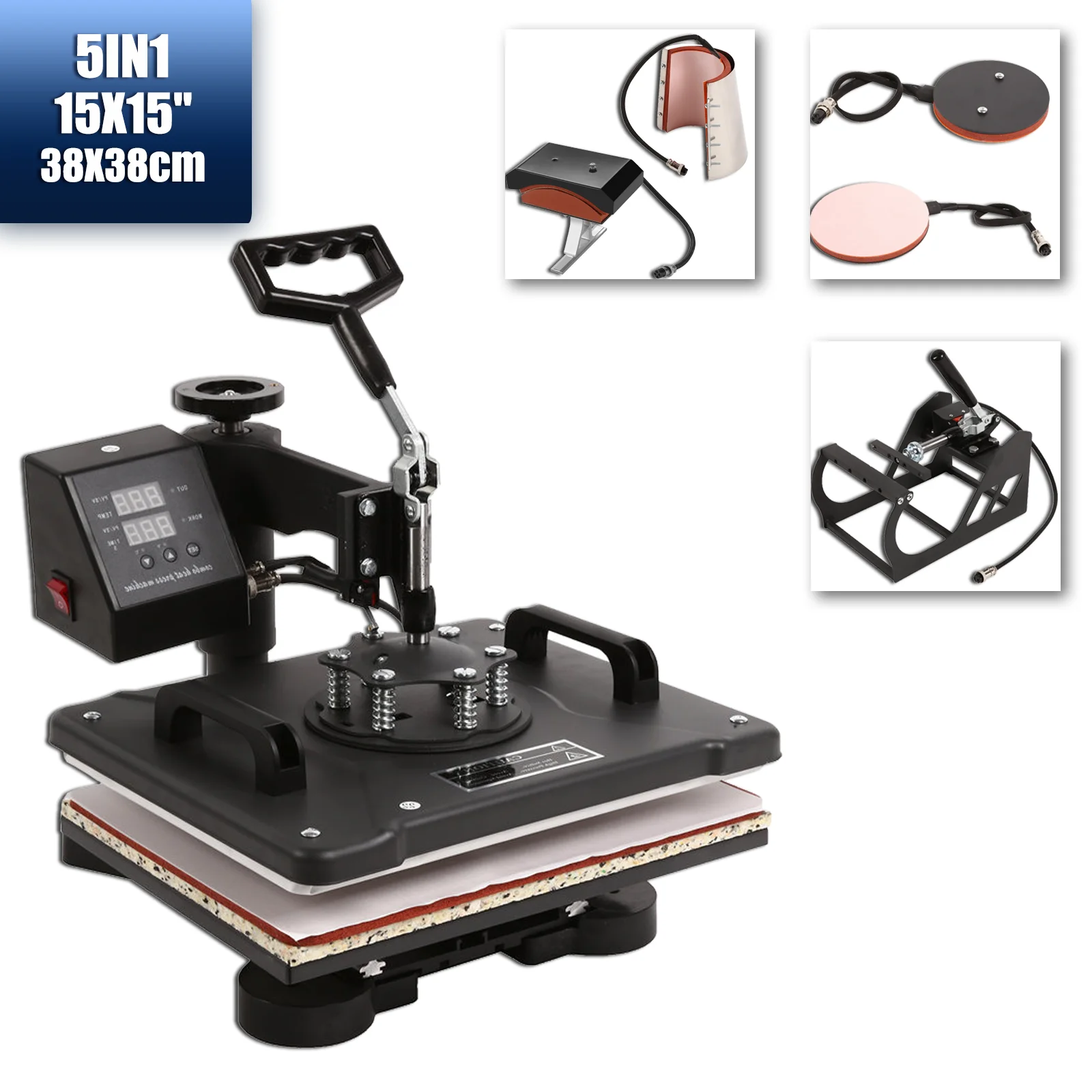 Эта машина для термопечати 5 в 1 используется для футболок, крышек, керамических пластин, керамической плитки, кружек, подставки, подушечек для мыши, пазлов, надписей и т. д. Тканей и материалов. Он может передавать красочные изображения и персонажи сублимированных и растворенных печатных чернил на керамику, очки и текстиль, такие как хлопок, лен, химическое волокно, нейлон и т. д. В этот универсальный пресс входят плоские тарелки, кружки и тарелки. Откачиваемый тепловой пресс может похвастаться всеми обязательными насадками. Он имеет встроенное тефлоновое покрытие 15 "x 15" (38x38см) Тепловое плато с полным спектром нагревательных катушек, чтобы обеспечить согласованность по всей поверхности. Управление цифровым таймером регулируется до 999 секунд. Характеристики цифрового температурного датчика от 0 - 200 °C (около 392 °F).
