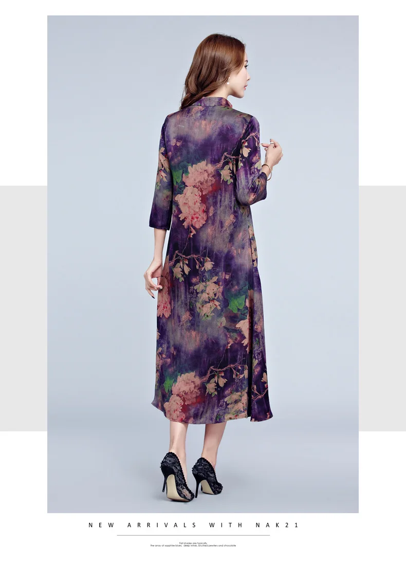 Фиолетовое платье-рубашка женская шелковая Большая одежда китайская винтажная Цветочная миди плюс размер праздничные платья Элегантное благородное платье с принтом QC9