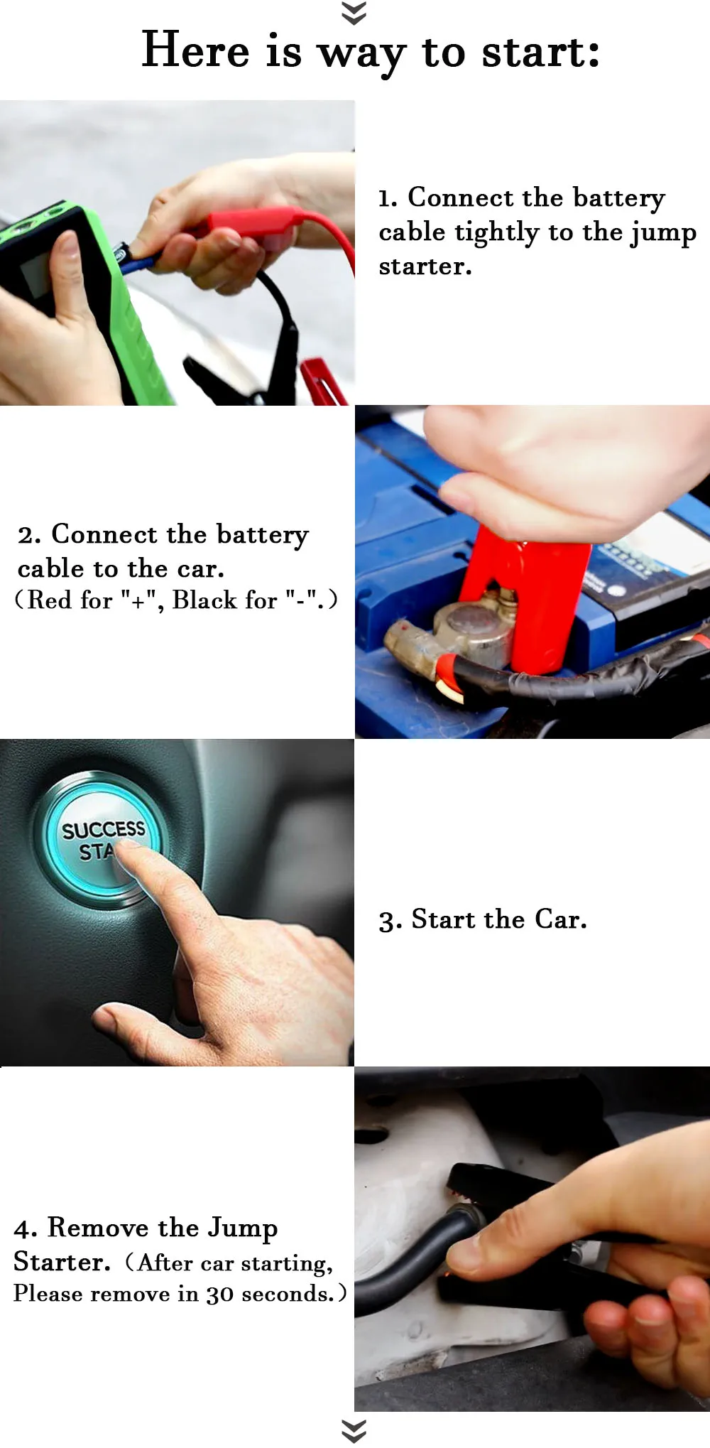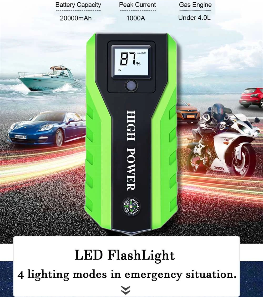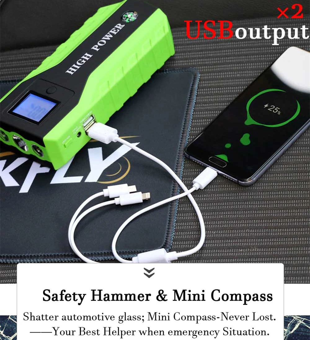 Стартер для автомобиля (внешний аккумулятор) * 1 зажимы для аккумулятора (красный = положительный; Черный = отрицательный) * 1 настенное зарядное устройство * 1 автомобильное зарядное устройство * 1 3 в 1 зарядный кабель * 1 Инструкция на английском языке * 1 чехол для розничного инструмента * 1 адаптер для прикуривателя в подарок * 1