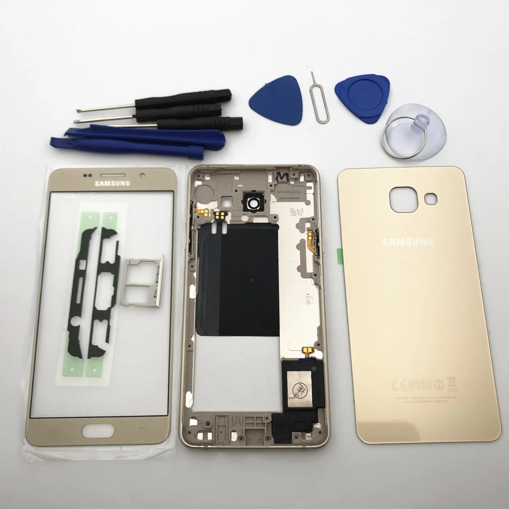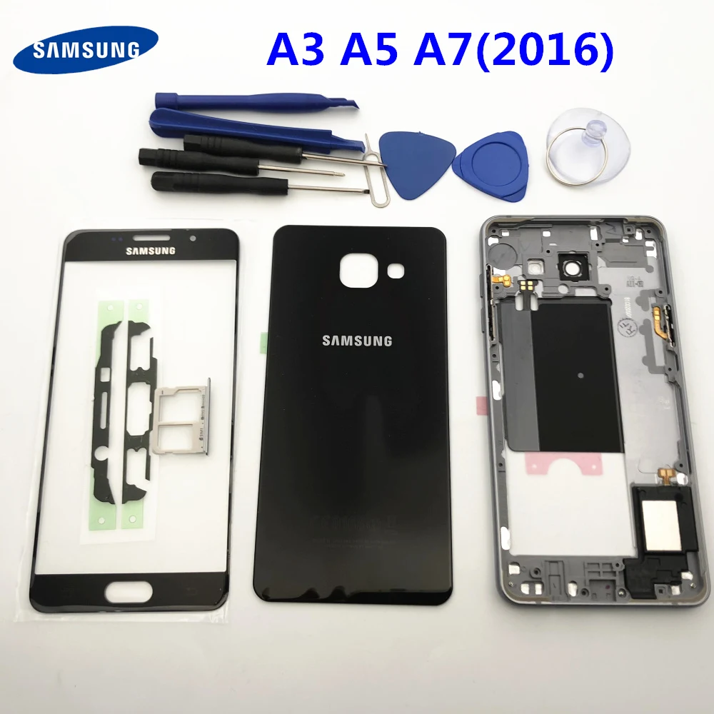 Замените поврежденный чехол, совершенно новый, высококачественный продукт с 100% точной посадкой! Полный корпус средняя рамка + чехол задняя крышка + передний экран стеклянный объектив для Samsung Galaxy A5 A510 A510F A3 A310F A7 A710F (2016) Посылка в комплект входит: 1 шт. х средняя рамка 1 шт. х Батарейная дверь 1 шт. X слот для sim-карты 1 шт х Клей 1 шт. X Переднее стекло для экрана 1 Набор инструментов в подарок