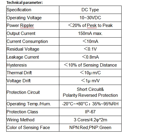 Бренд: Fotek Название продукта: датчик приближения (также называется датчиком) Модель: PL - 05 ns Характеристики 1. Все модели с защитой от короткого замыкания и полярностью обратной защиты. 2. Высокая прочная компактная структура IP-65 подходит для применения в плохих условиях. 3. Прецизионный регулятор легко получить лучшую регулировку чувствительности. 4. Все модели с операционным индикатором светильник, легко регулируется.