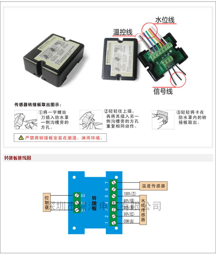 Плата переключателя уровня воды играет роль преобразования между контроллером и датчиком уровня воды и температуры воды. Соединительная пластина соединена с контроллером через две или три линии для переноса температуры воды и уровня воды резервуара для воды на контроллер. Соединительная пластина может быть помещена в водонепроницаемую крышку для размещения рядом с резервуаром для воды, что значительно экономит отходы на большом расстоянии и многоканальное расширение и повышает точность измерений. Водонепроницаемый чехол имеет определенное водонепроницаемое свойство, но он будет мочить в течение длительного времени или рядом с водяным паром. Это сделает переключатель влажным и повлияет на значение измерения. Поэтому рекомендуется, чтобы клиент поместил плату для переноса уровня воды в место, где плата для переноса сыра от дождя, капельной воды, водяного пара и т. д. Переключатель уровня воды в сочетании с контроллером с уровнем воды. Подходящие модели: BF-KT4, BF-DKT4, BF-8805A, BF-450T и BF-3030. В сочетании с BF-KT4, BF-DKT4 и BF-450T для подключения к контроллеру 6 и 7 футов требуются только два разъема A1 и A2. В сочетании с BF-8805A и BF-3030 три клеммы A1, A2 и A3 подключены к контроллеру 6, 7 и 8 футов. Для детальной проводки обратитесь к инструкции каждого контроллера.
