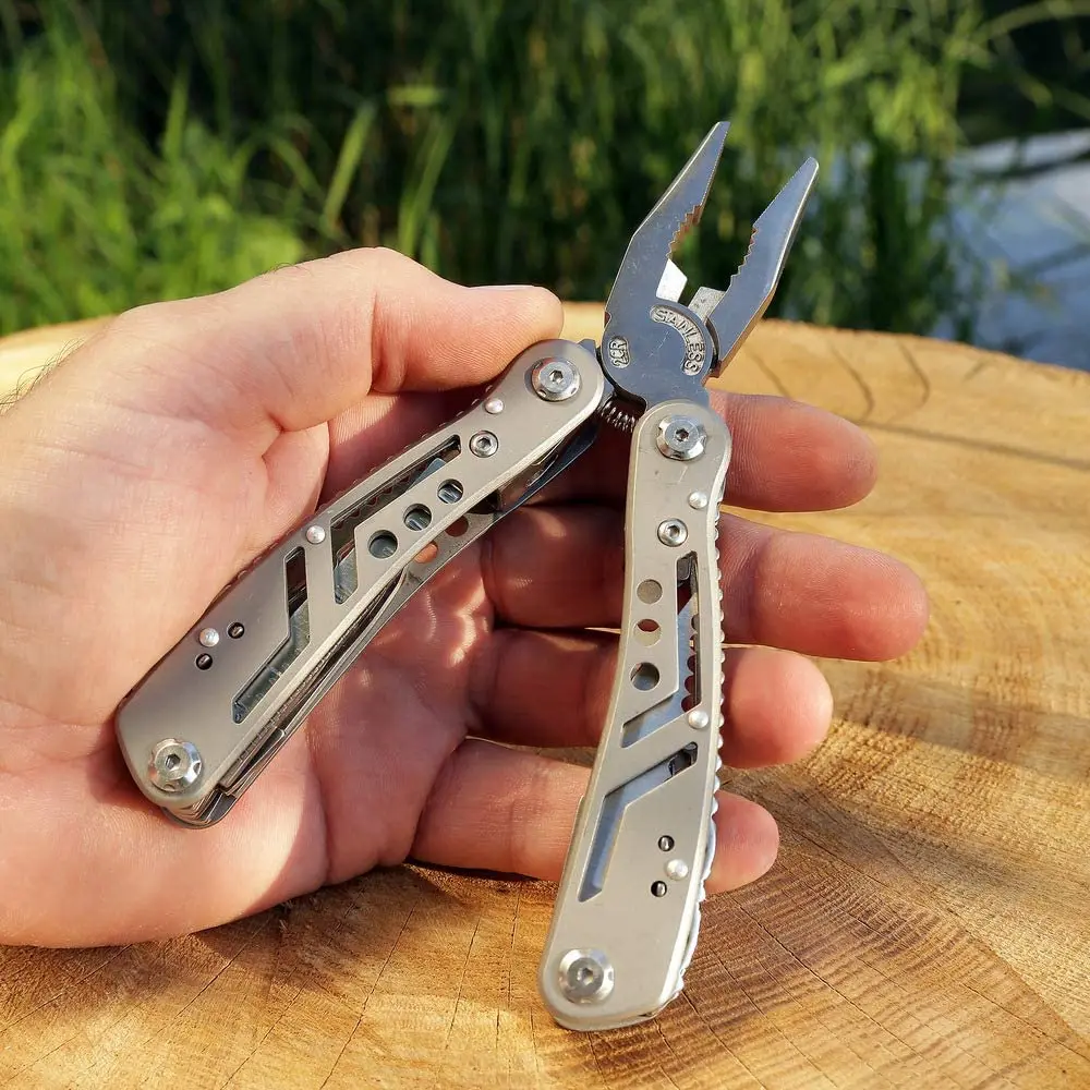 Пружинные плоскогубцы, проволочный резак и Стриппер, складной зубчатый и основной нож, консервный нож и открывалка для бутылок, металлический файл, отвертки, 11 прикрепляемых бит с магнитным соединителем, скребок и шило. Это настоящий многофункциональный инструмент.