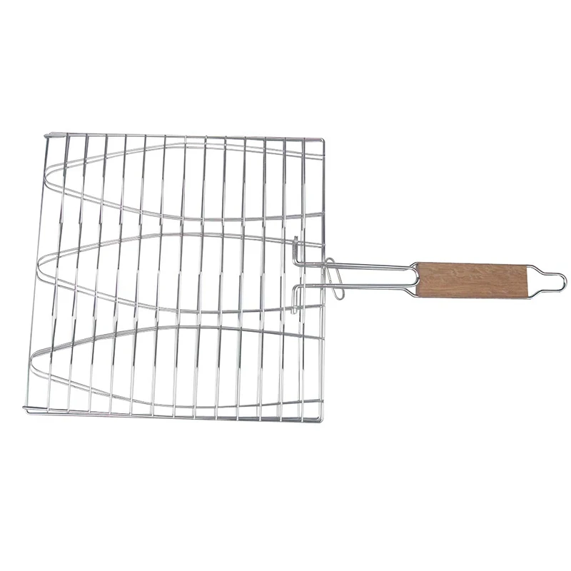 Рыболовная сетка для гриля для барбекю на открытом воздухе, гриль для рыбы, принадлежности для барбекю, антипригарный тройной рыбный гриль, корзина с деревянной ручкой, инструмент для барбекю