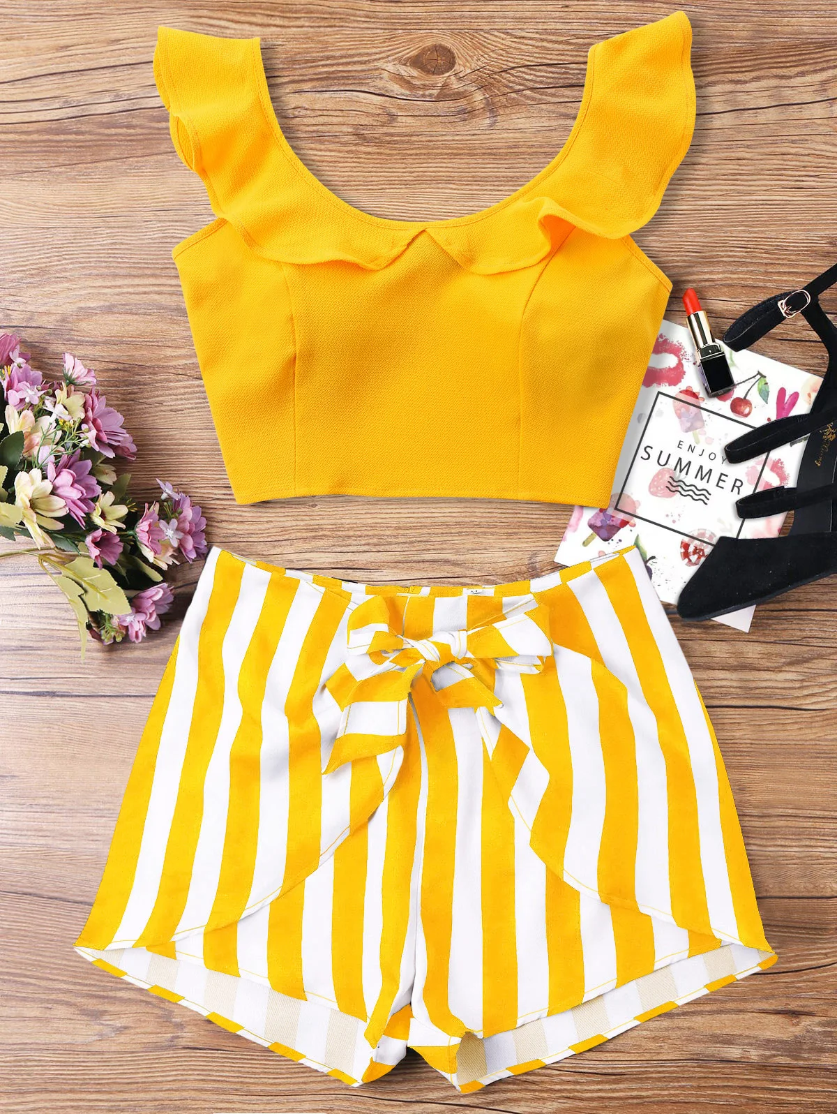 Тканый комплект с укороченным топом с однотонным дизайном, глубоким вырезом и оборками, которые попадают в рукава-крылышки, а также шортами со всей полосой в двухцветном дизайне, спереди С Завязанными деталями, высокой посадкой и задней потайной молнией.