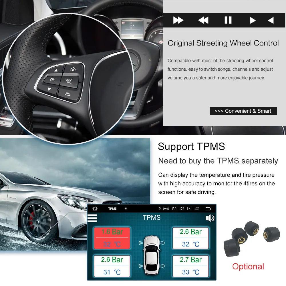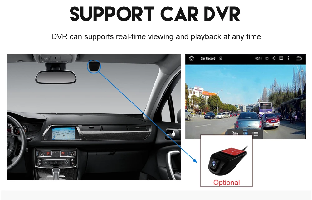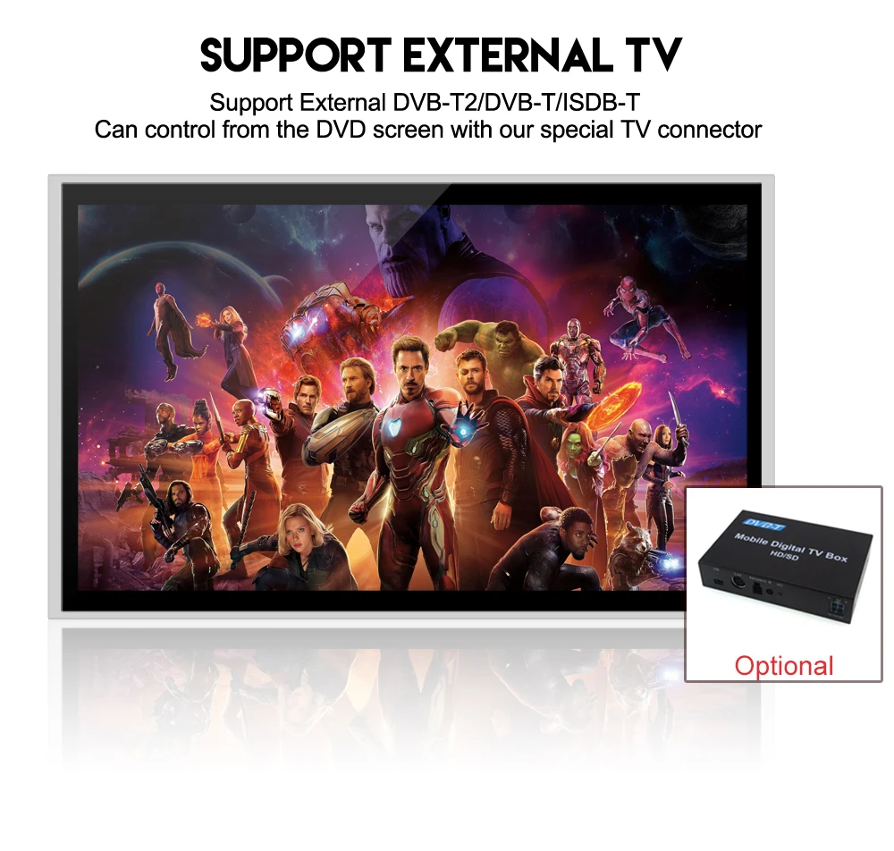 1. Поддержка функции DVR: Поддержка DVR для передней части, это позволит вашему путешествию больше безопасности. 2. Поддержка внешнего приемника DAB (работает с помощью экрана Toush) 3.OBD Поддержка TPMS, после установки tpms вы можете проверить давление в шинах автомобиля на экране нашего продукта. 4. Поддержка ТВ: может поддерживать DVB-T2/ISDB-T, с нашей DVB-T2/ISDB-T коробкой и разъемом, вы можете работать на нашем автомобильном DVD-экране 5. Поддержка камеры заднего вида, когда вы переворачиваете автомобиль, он будет работать автоматически, он может отображать реверсирующий трек.