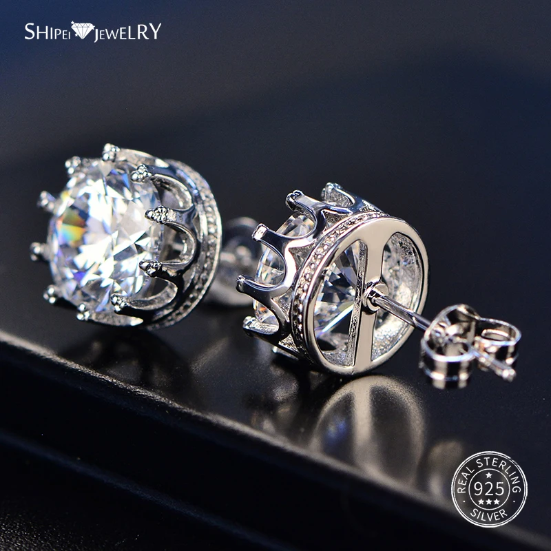 Шипай 100% 925 стерлингового серебра ювелирные украшения 8 мм белый натуральный сапфир стильные серьги-гвоздики в виде короны для мужчин и женщин, подарок на день рождения