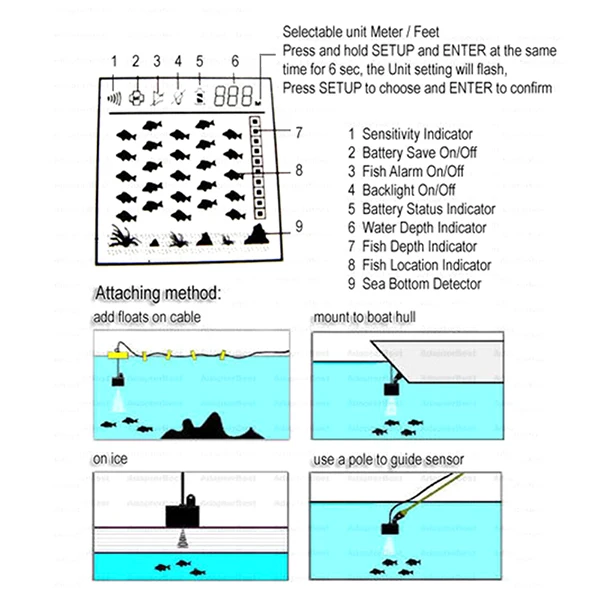 8) пользовательский выбор чувствительности Зума,Единицы измерения, дальность глубины, сигнал тревоги, значок рыбы, сигнализация рыбы,И настройка скорости