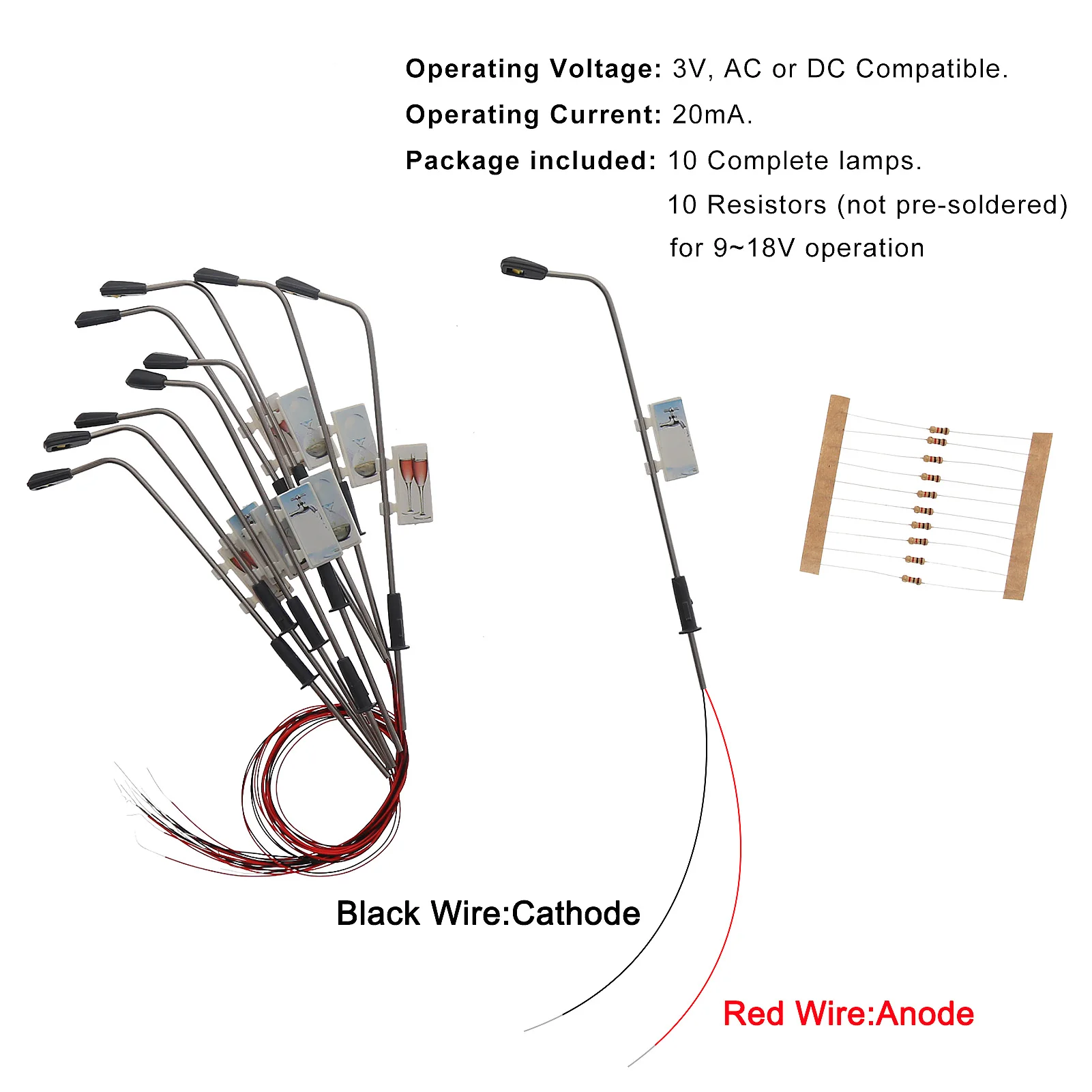 Совершенно новый. Идеально подходит для железной дороги и строительства! Сделано со светодиодами. В комплекте с проводами и светодиодами и могут быть освещены. Эти фонарные столбы подходят для использования только при напряжении питания 3 В. Не используйте их непосредственно на 12 В или 16 В, чтобы избежать повреждения светодиодов. Вы должны подключить резистор в серии, прежде чем вы будете использовать их на 12V или 16V, я поставлю совместимые резисторы бесплатно. Пожалуйста, примените правильный рабочий ток 20 мА к каждому светодиодный. Примечание: Поскольку размер выше измеряется вручную, размер фактического товара, который вы получили, может немного отличаться от размера выше. Между тем, напоминаем, что из-за световых эффектов, настроек яркости/контрастности монитора и т. д. могут быть некоторые незначительные различия в цветовом тоне фотографий и фактического товара.