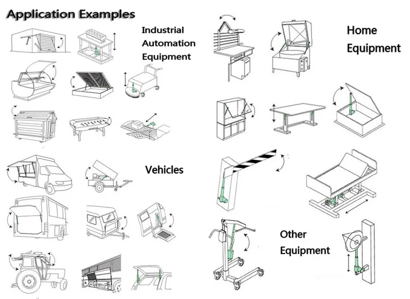 - Используется в подъеме для спинки сидений самолетов, кораблей, Автомобиля Люкс; Линейный push-pull и телескопический для массажных кресел, массажных кроватей, пожарной техники, медицинского оборудования, мебели и т. Д.