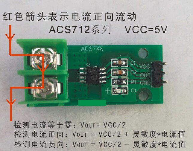 1. Основные параметры:Модуль обнаружения тока использует чип ACS712ELC-20A, который относится к типу Holzer.Изоляционное напряжение: 2.1кв, обратите внимание, что это изоляционное напряжение, а не фактическое напряжение. Если есть какие-либо сомнения, пожалуйста, позвоните.Диапазон обнаружения: +-20A токНапряжение источника питания: VCC = 5 ВЧувствительность на выходе: 100 мВ/AТеоретические Выходное напряжение:Ток равен 0: VOUT = VCC/2Когда ток движется вперед, VOUT = VCC/2 + чувствительность * ток.В настоящее время в обратного потока: VOUT = VCC/2-чувствительность * токДве. Введение схема