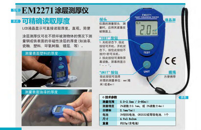 Толщина прибор EM2271 покрытие может использоваться для измерения толщины немагнитные покрытий на железе, сталь, алюминий или поверхности (такие как краска, глазурь, эпоксидная смола, покрытие и т. д.), не повреждая объекта.Диапазон измерения: 0,0 мм-2,0 мм 0mil ~ 80milТочность измерения: 2% показания + 0,1 мм или 2% показаний 4milПримечание: точность гарантирована при 23 °C + + 5 °C, а относительная влажность менее 75%.Разрешение: 0,1 мм/1milБатарея В: 3 в кнопочный аккумулятор, 1Размеры: 6,9x3,8x2 см