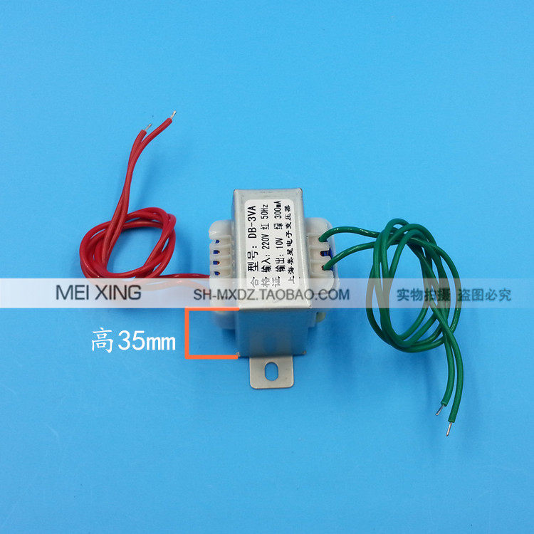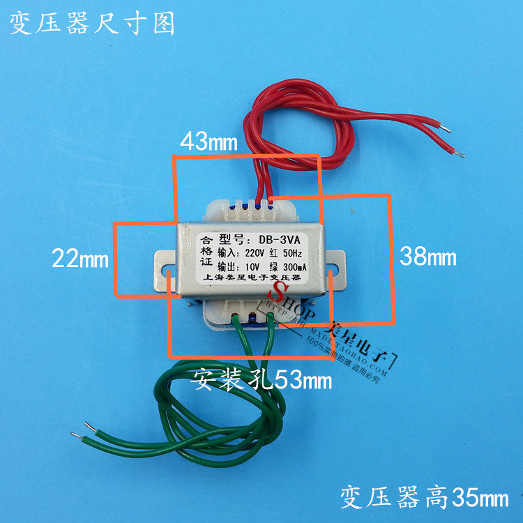 Название продукта: силовой трансформатор Модель продукта: EI41 * 20Входное напряжение: AC0-220V 50 Гц длина входной линии: 170 мм (красный)Выходное напряжение: 10 В переменного тока Длина выходной линии: 170 мм (синий)Номинальная мощность: 3 Вт 0.3A Вес: около 0.2GKРазмер внешнего вида: 43x38x35 мм Монтажное отверстие: 53 ммФорма конструкции: однофазный трансформатор характеристика частоты: частота мощности.Материал: медная эмалированная проволока + Лист кремниевой стали + устойчивый к ржавчине зажим для верховой езды + огнестойкий Скелет + супер мягкий электронный высокотемпературный провод.