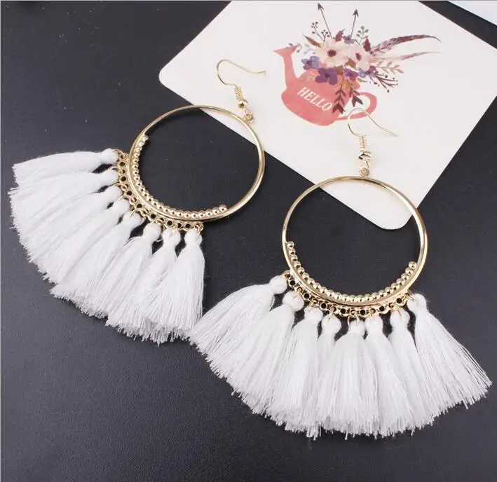 LOVBEAFAS, богемные длинные черные серьги с кисточками для женщин, винтажные Золотые круглые серьги-капельки, хлопковая веревка, бахрома, ювелирное изделие, подарок