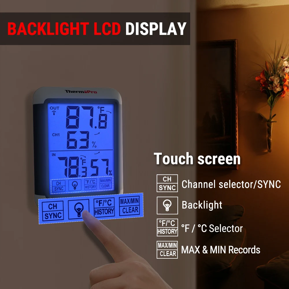 Оснащенный профессиональными датчиками качества, термометр ThermoPro TP65A обеспечивает точные измерения влажности и температуры в помещении и позволяет вам быть в курсе необходимости корректировки для вашего дома. Комнатный термометр и датчик влажности не просто являются высокоточными, но очень удобны в использовании с подсветкой для тех, кто в последнюю минуту проверяет показания тока перед сном.