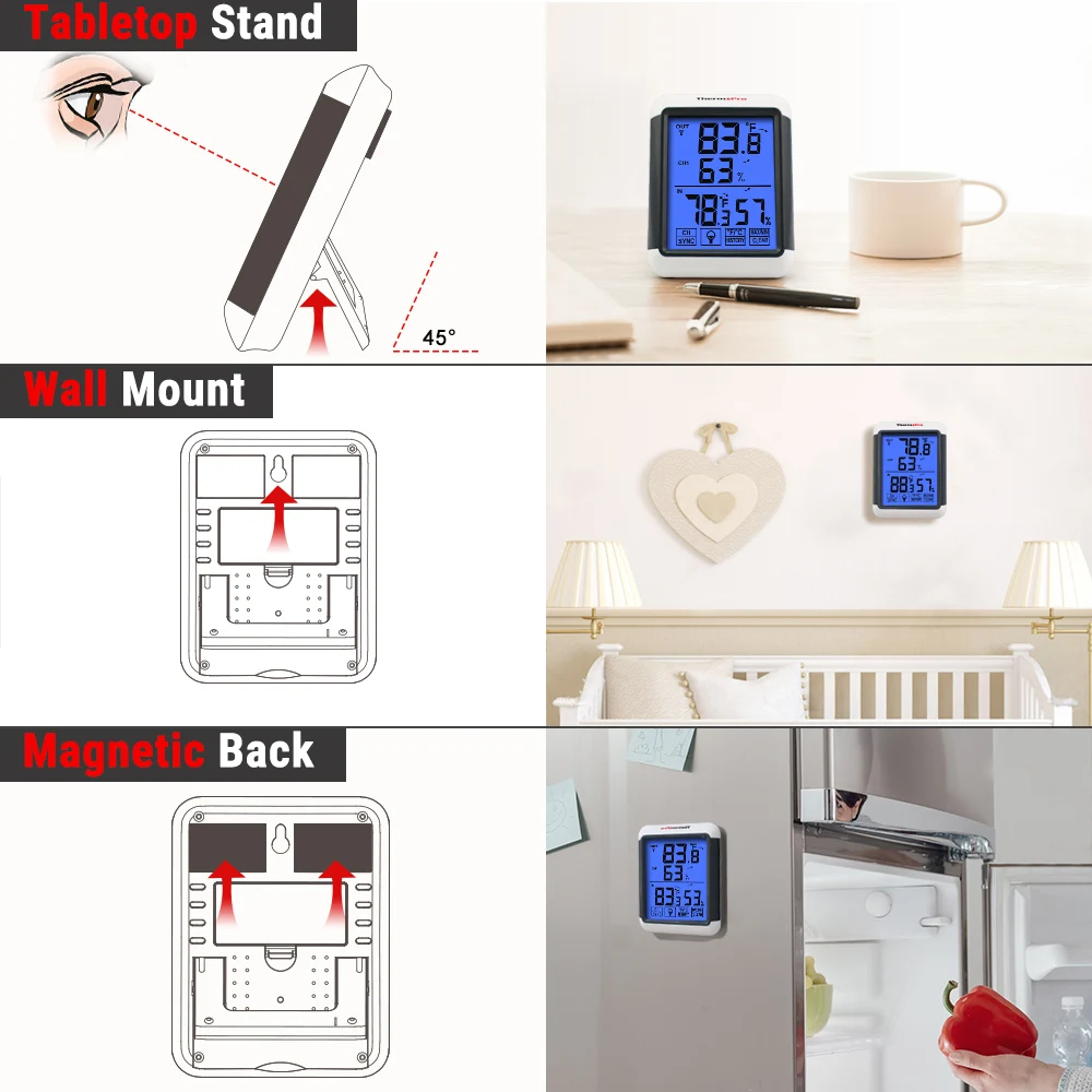 Цифровой наружный термометр с магнитной спинкой позволяет легко прикрепить к любой металлической поверхности; Подвесное отверстие для крючков; Столешница для любой ситуации, который поможет вам разместить термометр на открытом воздухе в любом месте, чтобы соответствовать потребностям вашего дома!
