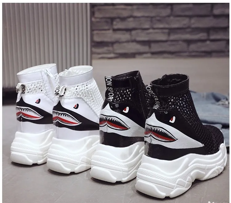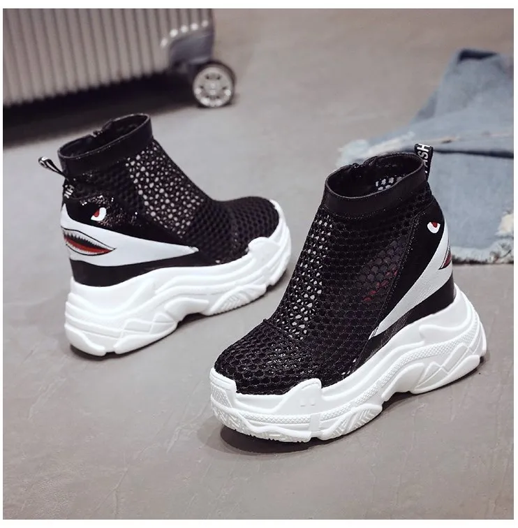 Новинка 2018 года, летние женские кроссовки на танкетке, увеличивающие рост, на платформе, с молнией, на каблуке 11 см, с сеткой, белые, черные, повседневная обувь