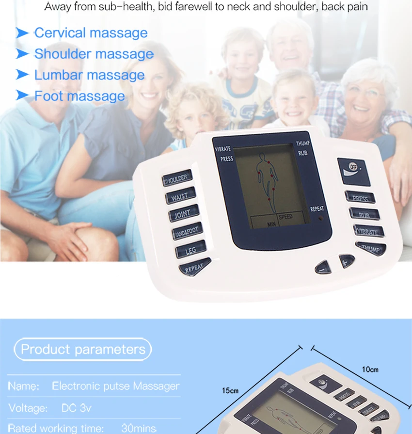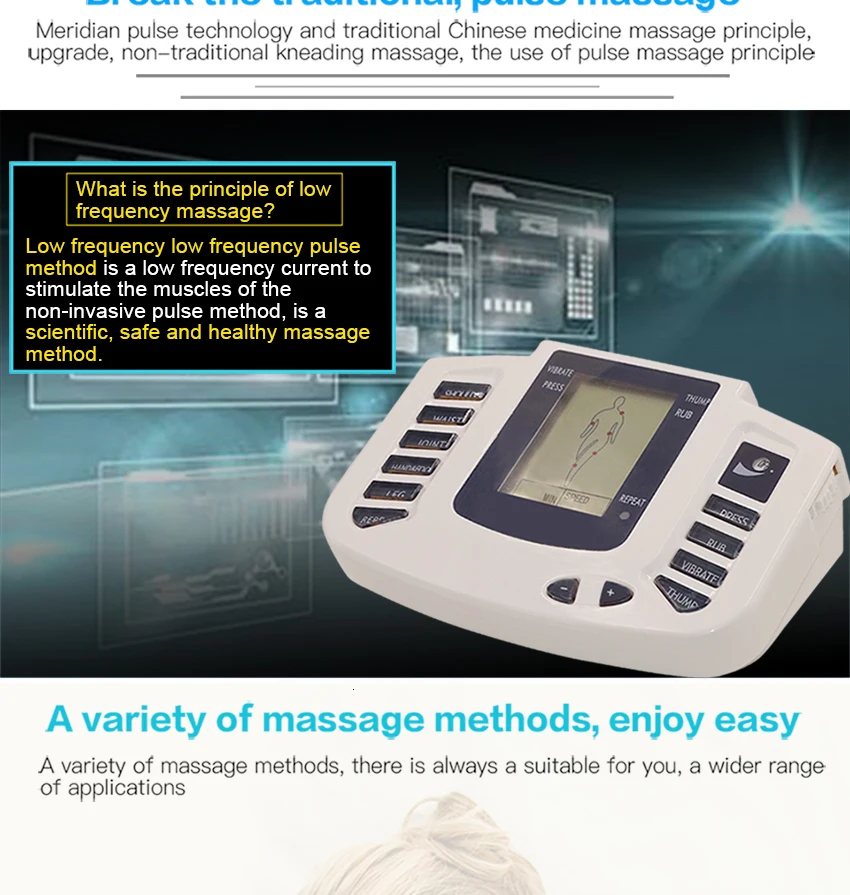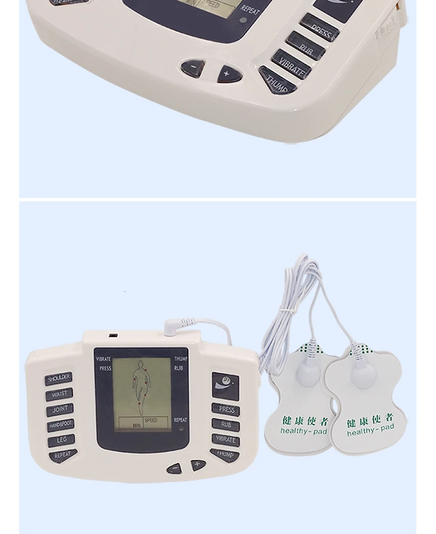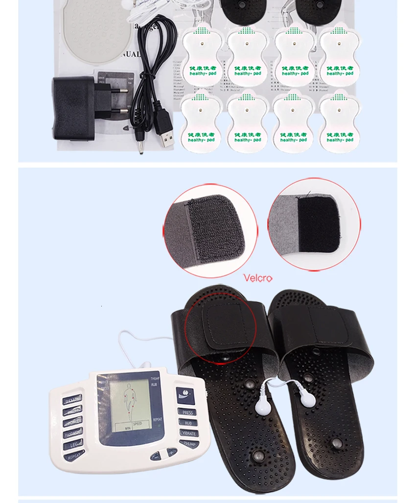 Пожалуйста, следуйте Шагу 1, шагу 2, шагу 3: 1. Приклейте электроды непосредственно на кожу для массажа (обработка не может быть осуществлена, если оба электрода или четыре электрода на поверхность тела). 2. Включите питание. 3. Здравствуйте, клиент, пожалуйста, обратите внимание: правильный метод: Когда вы включите mechine, вы должны носить тапочки в то же время, если вы используете тапочки, если вы используете его для массажа своего тела, вам нужно прикрепить к телу электродыОсобенности: